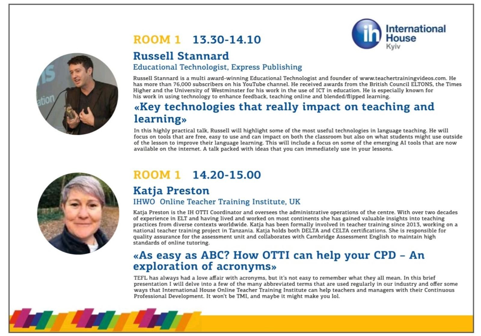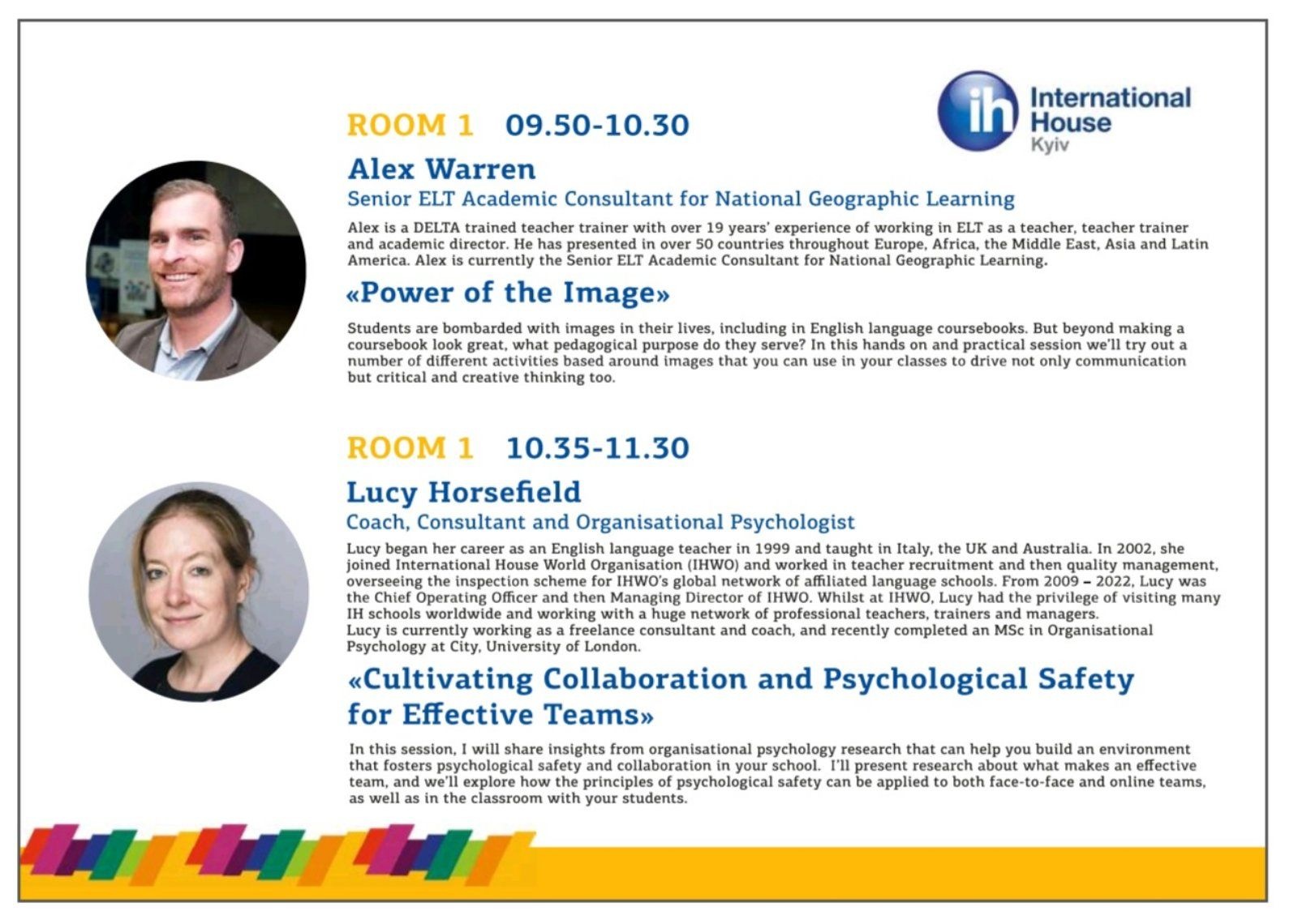 В ході конференції всесвітньо відомі тренери, коучі, автори улюблених ELT видань, IH- колеги з усього світу надали практичні навички та техніки сучасного викладання іноземних мов, створення англомовного середовища для обміну досвідом та інноваційними практиками усім викладачам, що прагнуть відповідати сучасним вимогам та викликам. Провели фахові кваліфікаційні тренінги з комунікативної методики для вчителів та викладачів англійської мови за Кембриджськими та власними IHWO розробками.