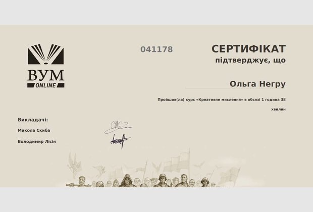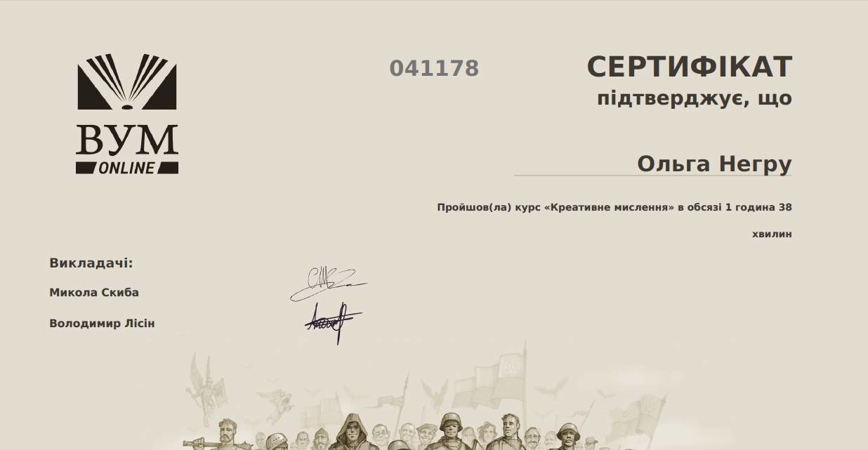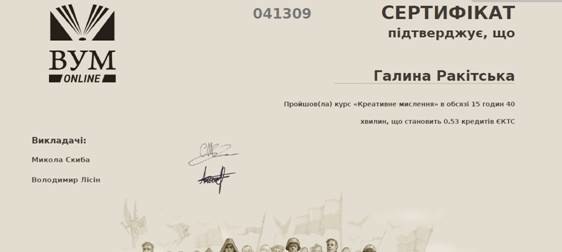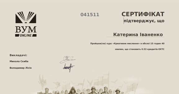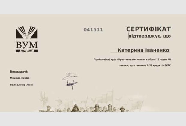 Під супроводом викладача кафедри економіки та менеджменту Придунайської філії Лаврової І. А. студенти 3 курсу денного відділення спеціальності «Економіка» пройшли онлайн-курс «Креативне мислення» в обсязі 15 годин 40 хвилин , що становить 0, 53 кредитів ЄКТС та отримали сертифікати.