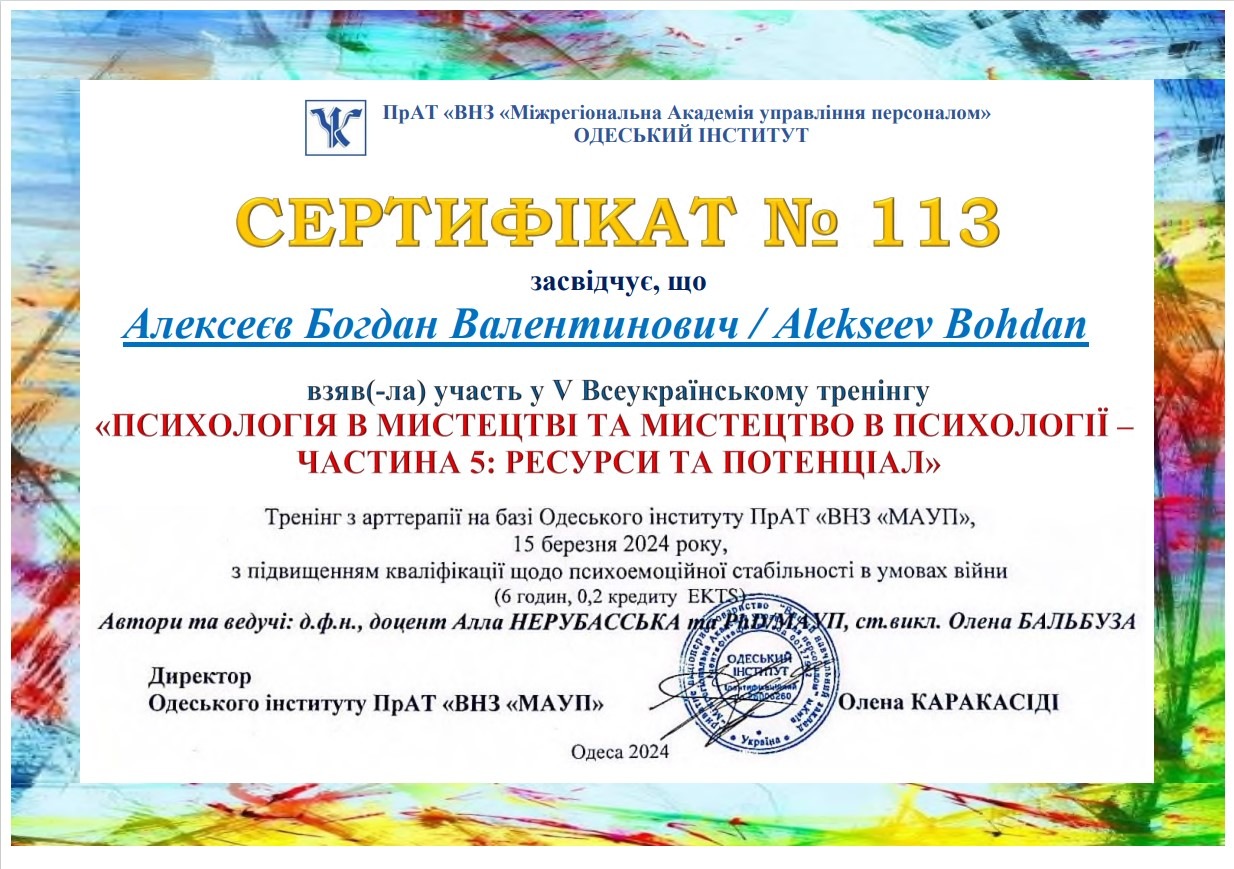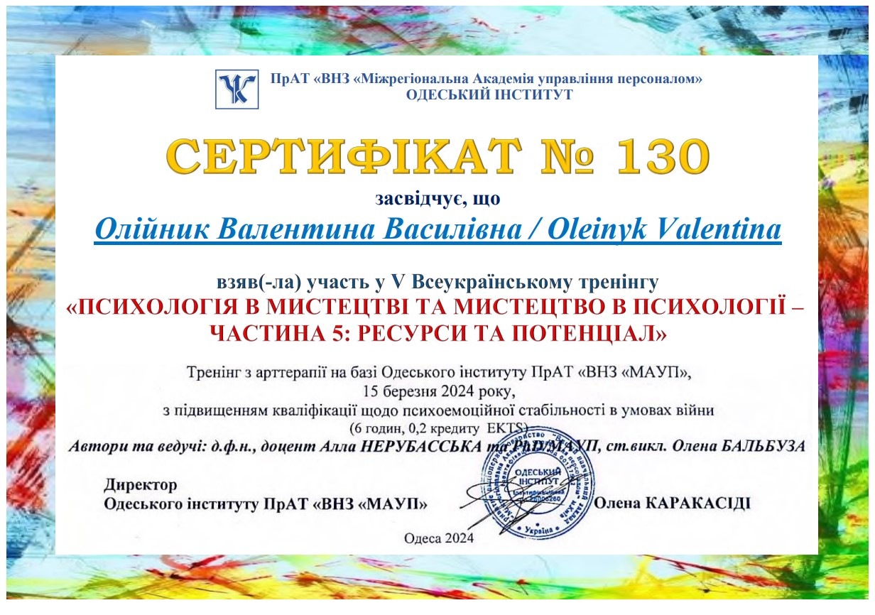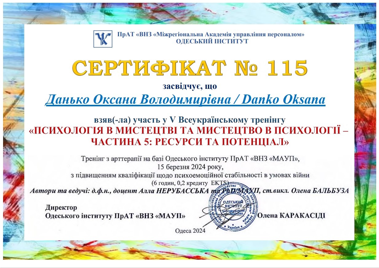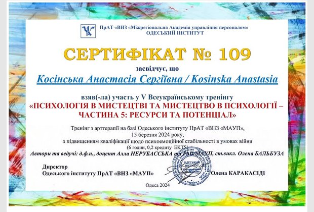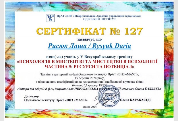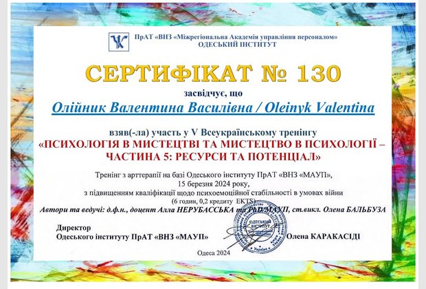 15 березня 2024 року викладачі кафедри психології та студенти-психологи бакалаврату денної форми навчання Хмельницького інституту МАУП взяли участь у Всеукраїнському заході у рамках програми підвищення кваліфікації науково-педагогічного складу Президентського та Всеукраїнського університетів Академії: лекції-тренінгу «Психологія в мистецтві та мистецтво в психології – частина 5: ресурси та потенціал».