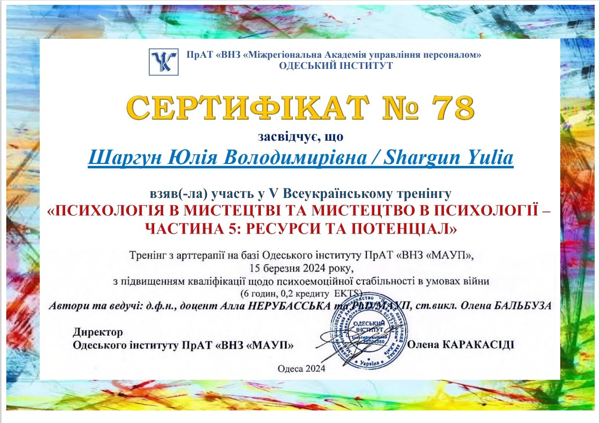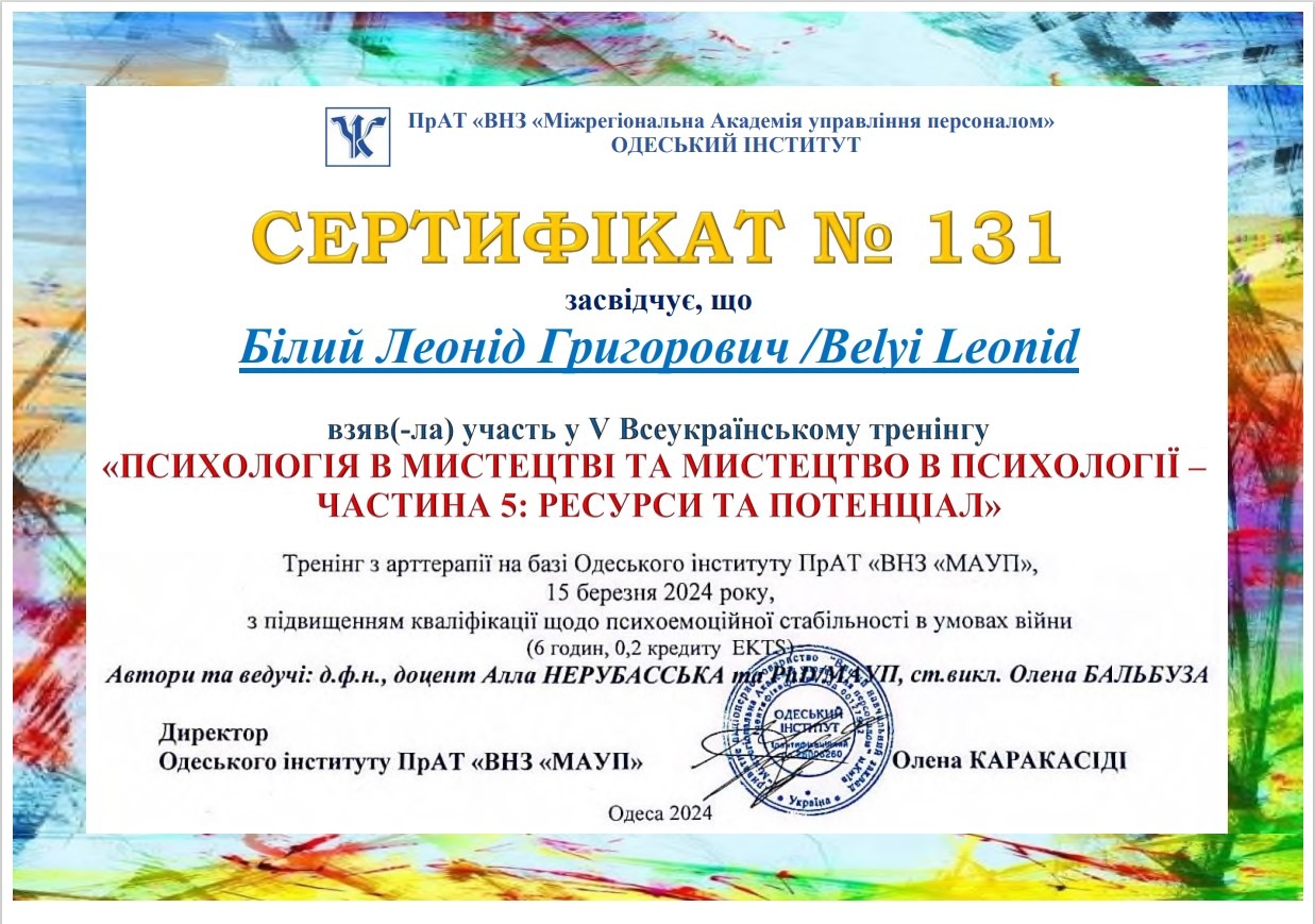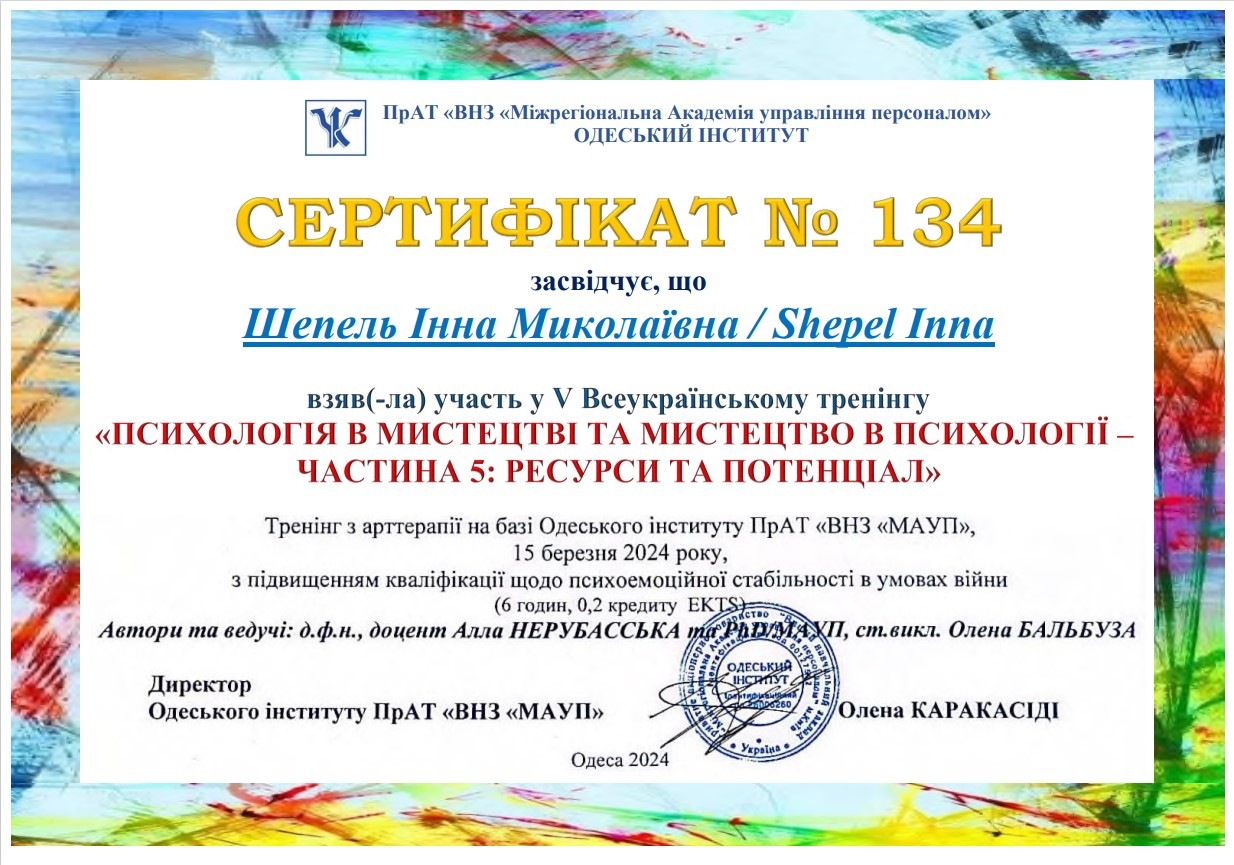 15 березня 2024 року викладачі кафедри психології та студенти-психологи бакалаврату денної форми навчання Хмельницького інституту МАУП взяли участь у Всеукраїнському заході у рамках програми підвищення кваліфікації науково-педагогічного складу Президентського та Всеукраїнського університетів Академії: лекції-тренінгу «Психологія в мистецтві та мистецтво в психології – частина 5: ресурси та потенціал».