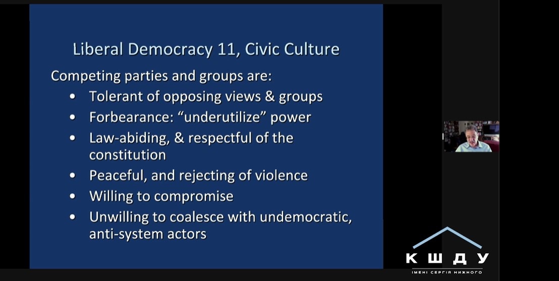 Вчений поділився своїми думками з приводу викликів розбудови демократії, які постануть у післявоєнній Україні. Зокрема, можливими труднощами щодо функціонування традиційних інститутів демократії, проведення виборів, розвитку інститутів громадянського суспільства.