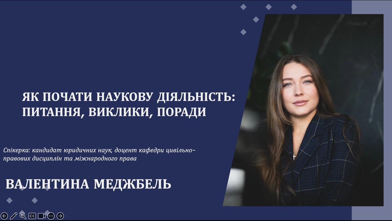 27 жовтня 2025 року в рамках діяльності наукового гуртка з міжнародного публічного та міжнародного приватного права «Міжнародне право та виклики сучасності», що діє на кафедрі цивільно-правових дисциплін та міжнародного права ННІП імені князя Володимира Великого відбувся майстер-клас на тему: «Як розпочати наукову діяльність: питання, виклики, поради». Спікером виступила керівник гуртка Меджбель Валентина Іванівна.