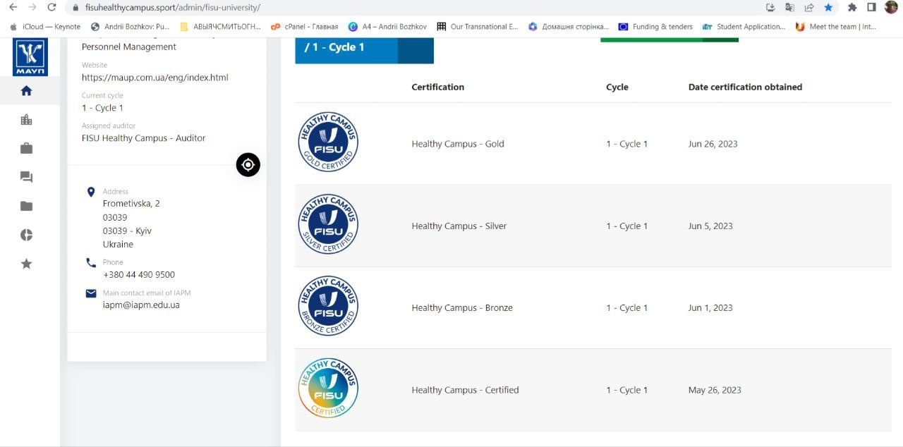МАУП першою в Україні отримала золотий сертифікат Програми FISU Healthy Campus