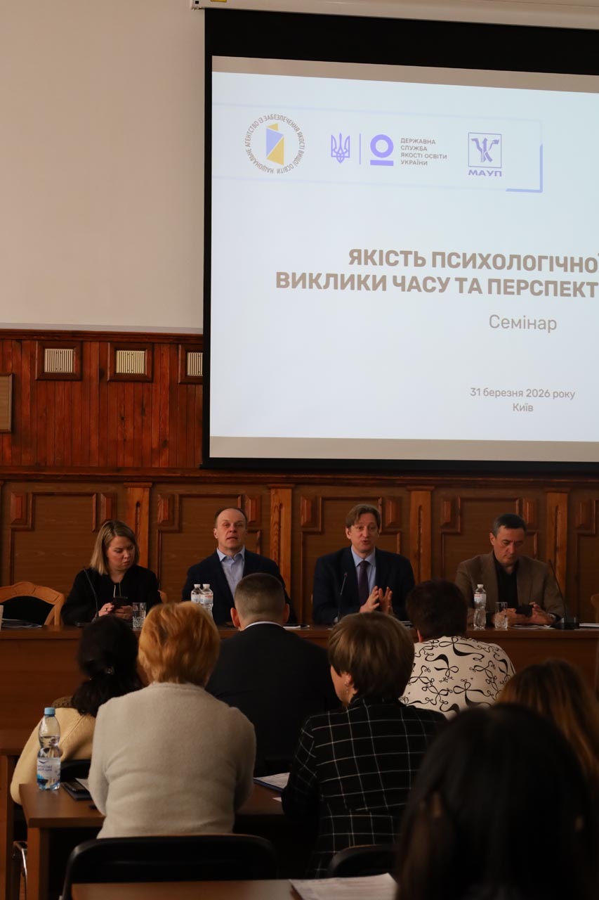 31 березня 2026 року на базі Міжрегіональної Академії управління персоналом (МАУП) у місті Києві відбувся всеукраїнський семінар «Якість психологічної освіти: виклики часу та перспективи розвитку», який об’єднав провідних експертів у сфері вищої освіти, представників державних органів, науковців і практиків. Захід було організовано за участі Національне агентство із забезпечення якості вищої освіти і він став важливою платформою для фахового обговорення актуальних питань підготовки психологів в Україні в умовах зростаючого суспільного запиту на послуги у сфері ментального здоров’я.