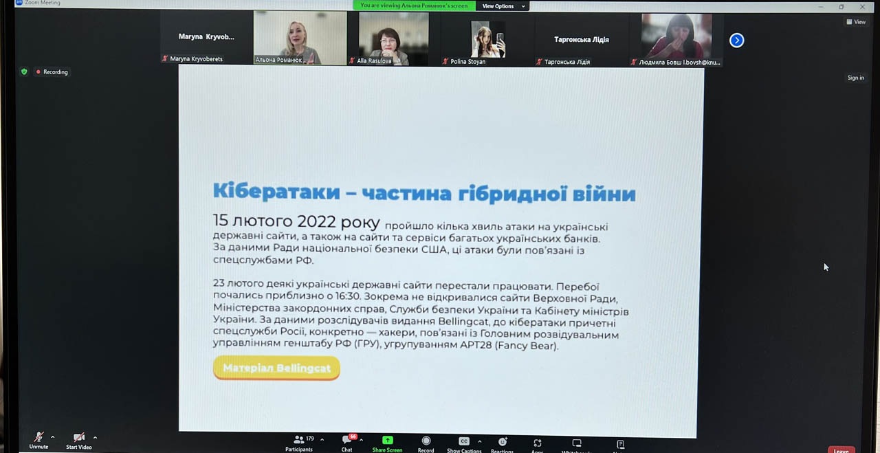 В ході проведення лекції було висвітлено ряд питань, а саме: інформаційні виклики та факууми в оточуючому середовищі; типи неправдивої інформації; кібератак як частина гібридної війни. Дякуємо за можливість долучитися до інформативного та цікавого заходу.