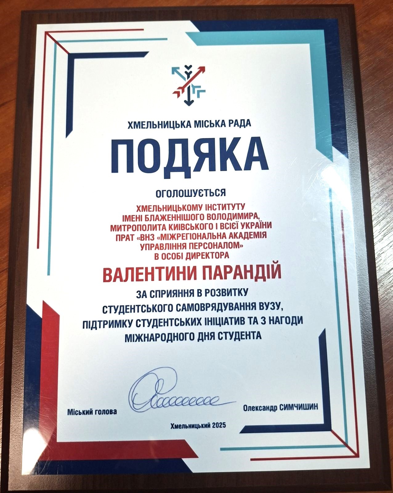 Надзвичайно приємно отримати з рук міського голови Олександра Симчишина нагороду – Подяку за сприяння в розвитку студентського самоврядування, підтримку студентських ініціатив та з нагоди Міжнародного Дня студента.