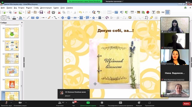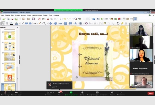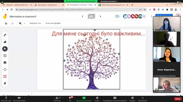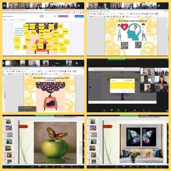 У тренінгу прийняли участь більше 180 колег та студентів із різних куточків України. Перша частина була присвячена виявленню психічних станів за допомогою сучасних методів опитування та Jambord, для корекції станів учасникам запропонували попрацювати у групах, в яких були завдання на вирішення ситуацій в позитивному напрямку. Олена Бальбуза розповіла про стресофактори особистості, різільєнтність, якості, що допомагають переносити стреси без негативних наслідків тощо. В другій половині тренінгу Алла Нерубасська показала практичну вправу "Обійми метелика" та запропонувала сюррмарафон "Метелик - це Я: дотик до душі людини та мистецтва!". В основу вправи покладено проєктивну методику в психології - метафорично-асоціативні карти, в даному випадку - ресурсна колода з метеликами - символом душі, відродження та воскресіння. Вправа орієнтована на поповнення внутрішніх емоційних ресурсів.