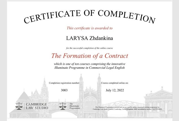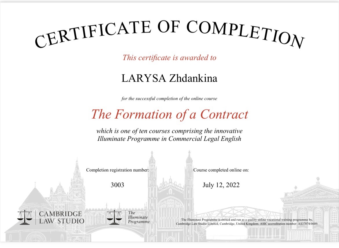 Будучи науковцем та практикуючим юристом Лариса Жданкіна пройшла навчання за онлайн-програмою англійської мови для юристів, що включає 10 курсів Кембриджської юридичної школи (Cambridge law studio), а саме курс «Укладання договору» («The Formation of a Contract»).