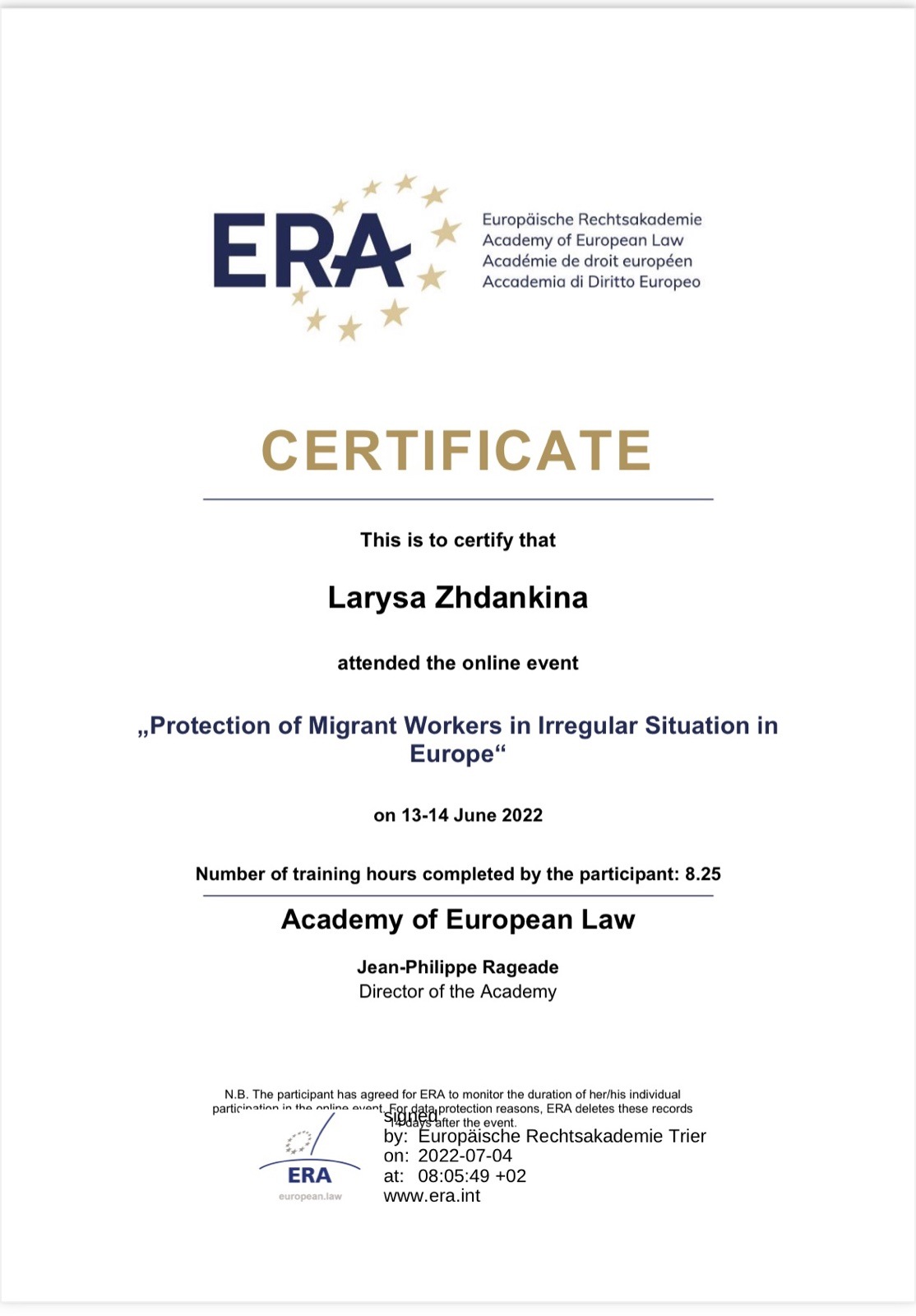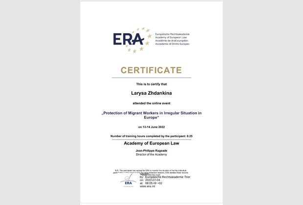 Лариса Жданкіна стала учасницею онлайн заходу «Захист працівників-мігрантів з нелегальним статусом у Європі» («Protection of Migrant Workers in Irregular Situation in Europe») від Академії Європейського права (Academy of European Law).