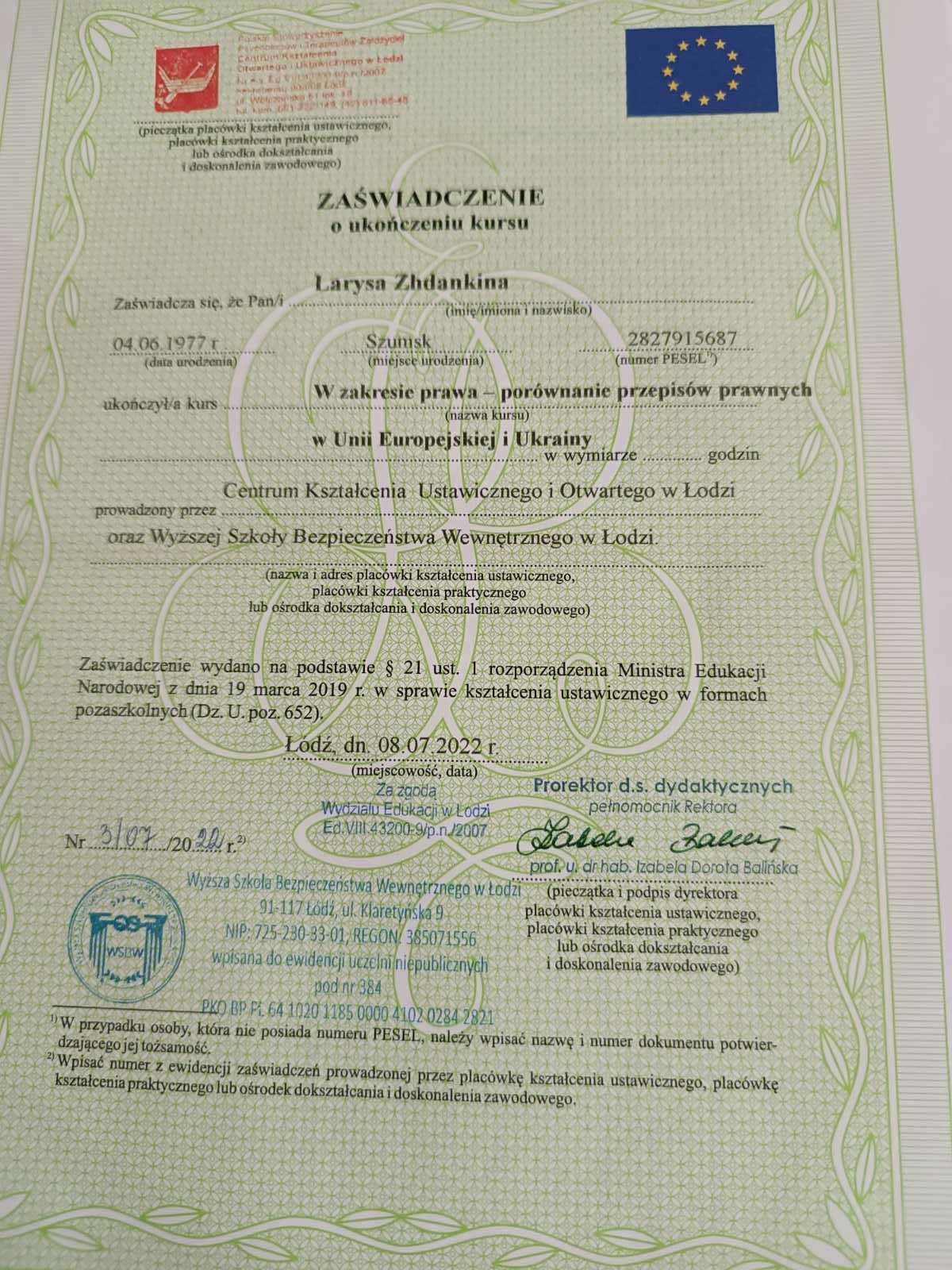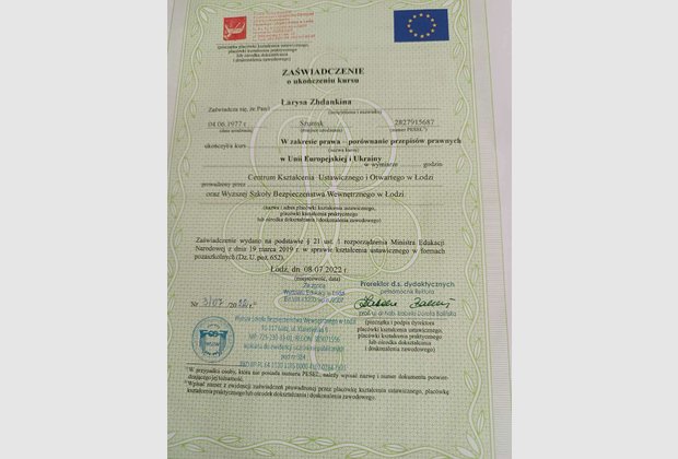 Також Лариса Костянтинівна пройшла підвищення кваліфікації в Центрі безперервної освіти у Лодзі (Польща).