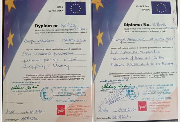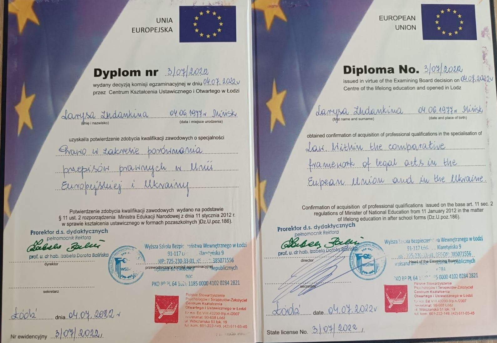 Доцент кафедри права та правоохоронної діяльності Хмельницького інституту МАУП Лариса Жданкіна пройшла навчання у Академії Європейського права (Німеччина), Cambridge law studio (Англія) та підвищення кваліфікації в Центрі безперервної освіти у Лодзі (Польща).