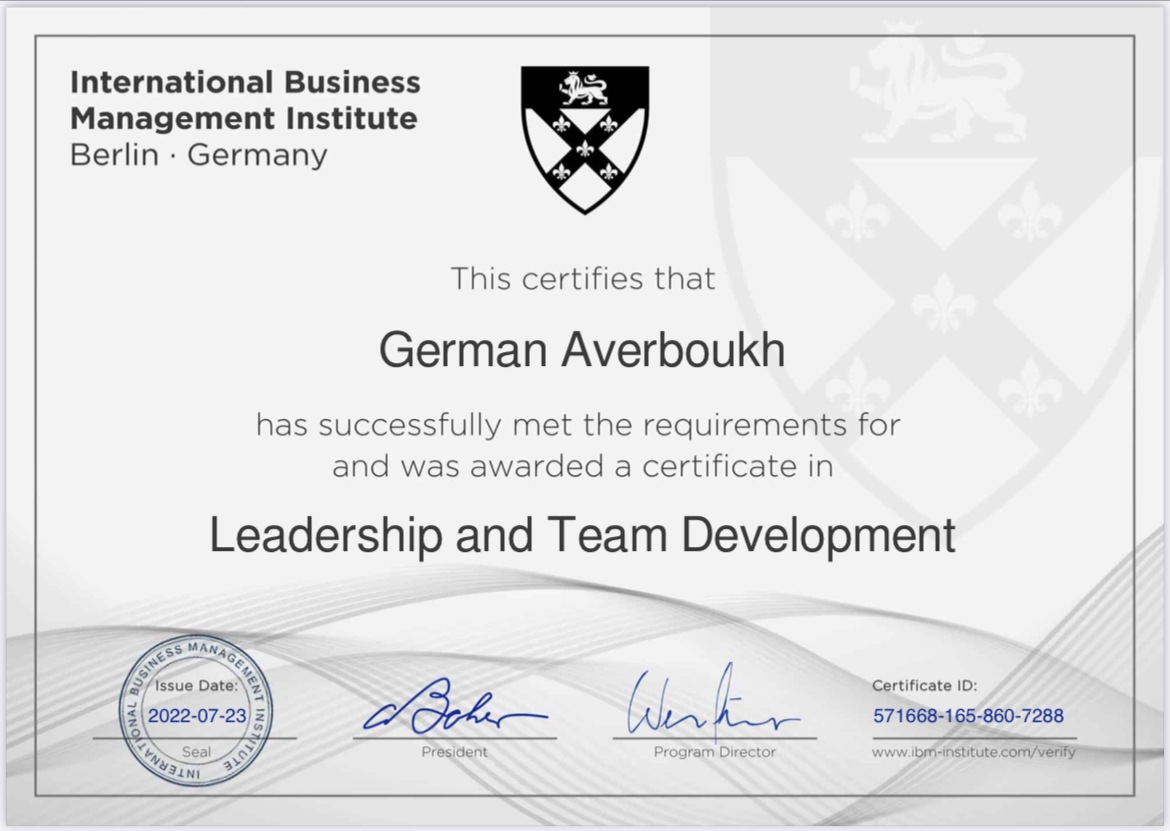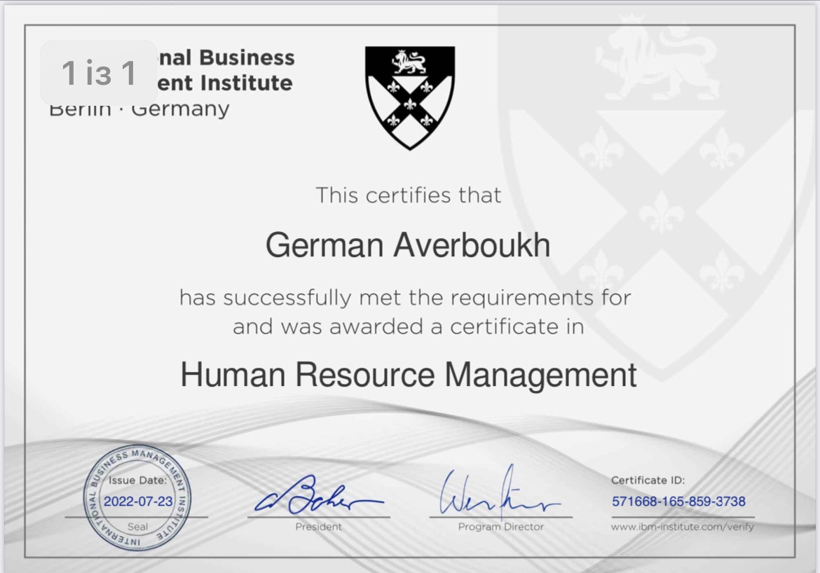 Аспірант кафедри публічного адміністрування МАУП Авербух Герман успішно завершив навчання за програмою онлайн-курсів від Берлінського міжнародного інституту бізнес-менеджменту. Вітаємо і пишаємося!