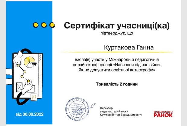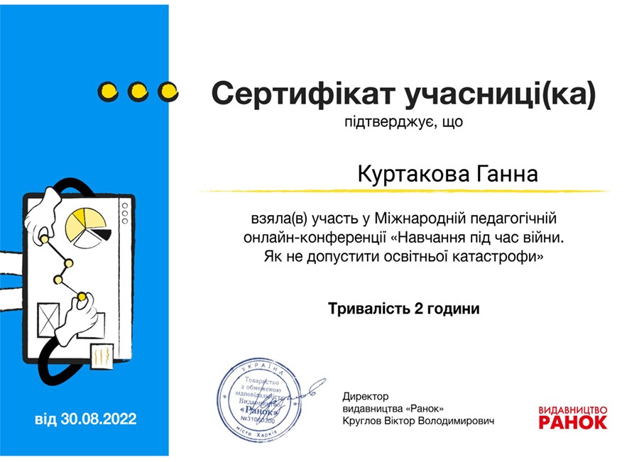 30 серпня 2022 року доцент кафедри цивільно-правових дисциплін та міжнародного права Навчально -наукового інституту права Куртакова Ганна Олександрівна прийняла участь у Міжнародній педагогічній онлайн-конференції «Навчання під час війни. Як не допустити освітньої катастрофи», у межах конференції була розглянута презентація проєкту «Навчання без меж» для всіх, хто бажає навчати й навчатися незалежно від обставин. Організаторами заходу виступили видавництво «Ранок» за сприяння ДНУ «Інститут модернізації змісту освіти».