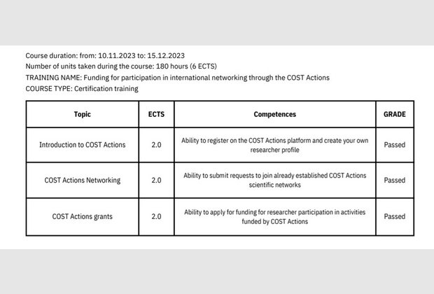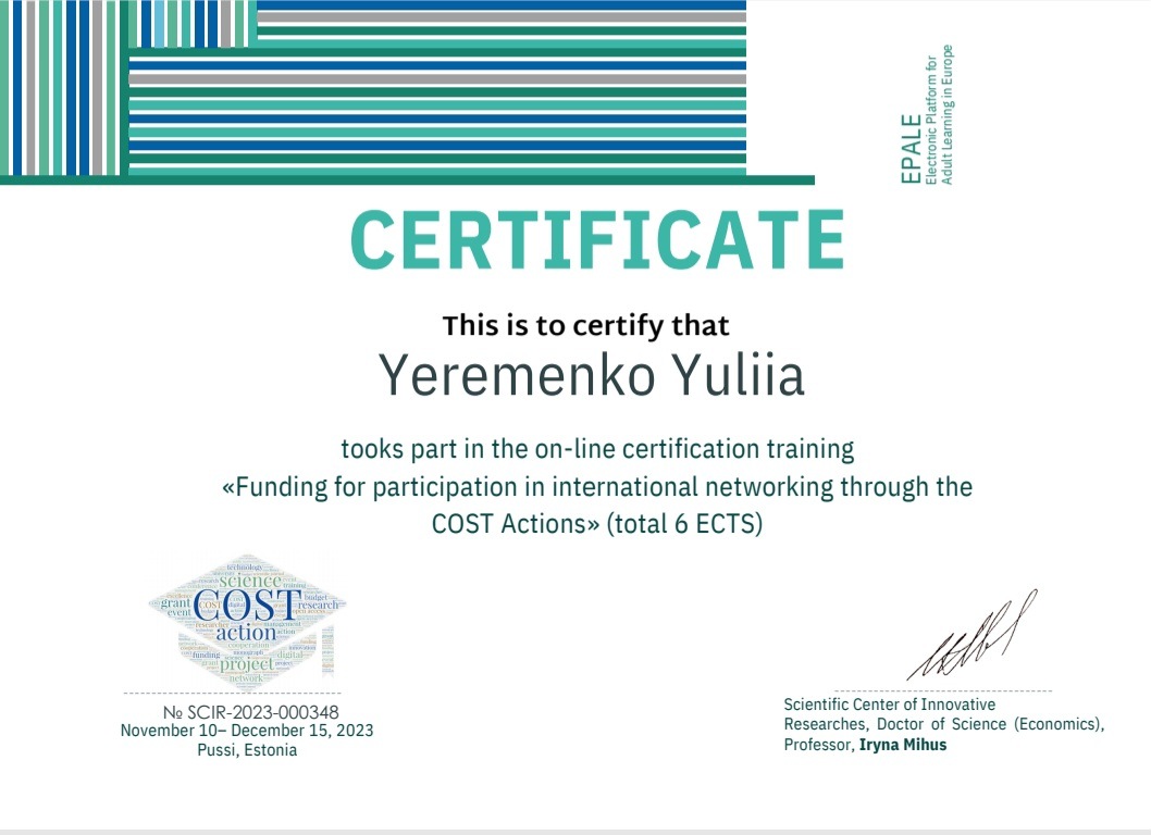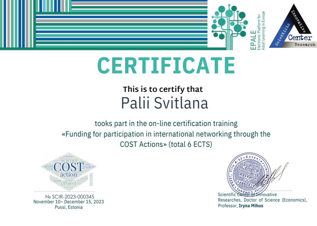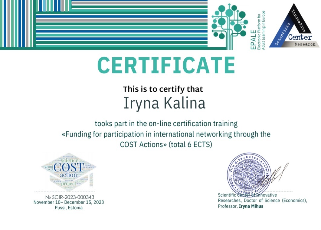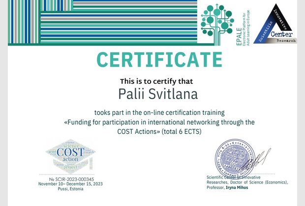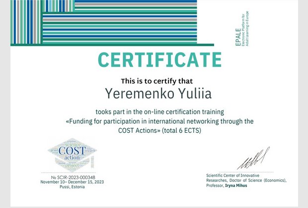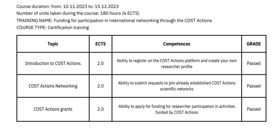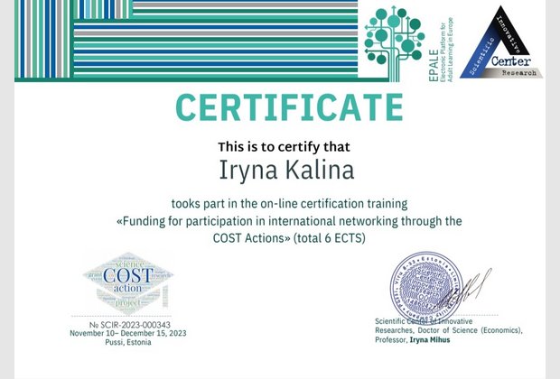 Науково-педагогічний персонал Інституту пройшли міжнародне стажування за темою: "Funding for participation in international networking through the COST project", в період з 10.11 по 15.12. 2023 року.
