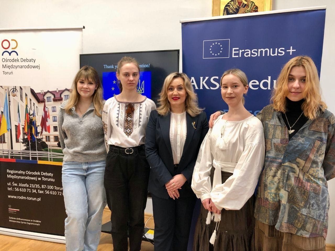 28 лютого на запрошення партнерського закладу вищої освіти Академії соціальної та медіа культури в Торуні та Регіонального осередку міжнародних дебатів директор Центру координації наукових видань та розвитку міжнародного співробітництва Людмила Крива та студентки МАУП 2 курсу спеціальності "міжнародні відносини" Кашуба Ольга та Дріч Олександра, студентки 2 та 3 курсу спеціальності "філологія" Валерія Наконечка та Єкатерина Козюн, котрі перебувають в польському закладі в рамках Програми академічної мобільності Erasmus+, взяли участь у міжнародномі семінарі "Медійний образ війни. Російська агресія проти Україні 2022-2024".