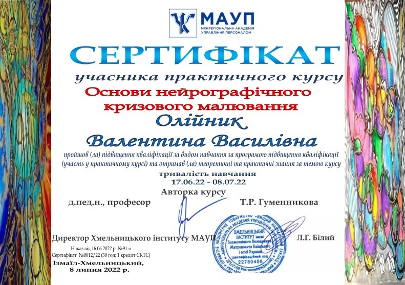 Нейрографувала разом із учасниками групи курсу «Основи нейрографічного кризового малювання» Валентина Олійник, к.пед.н., доцент; завідувач кафедри психології Хмельницького інституту МАУП. Брала участь в організації та розробці сертифікатів для учасників даного курсу.