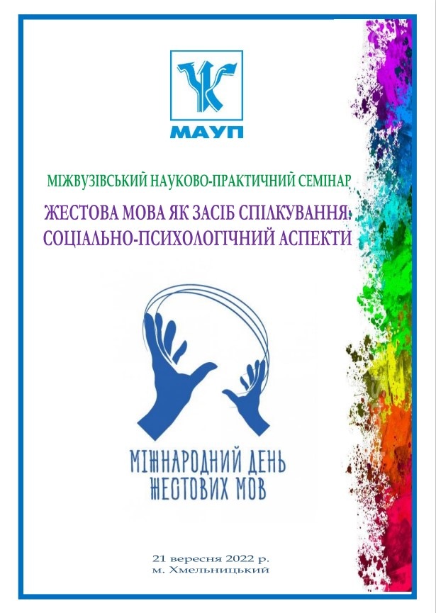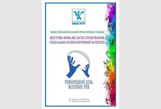 21 вересня 2022 року в рамках Міжнародного дня жестових мов та Міжнародного дня глухих відбувся міжвузівський науково-практичний семінар «Жестова мова як засіб спілкування: соціально-психологічні аспекти». Студенти-психологи 1-4 курсів та викладачі кафедри психології Хмельницького інституту МАУП і Придунайської філії МАУП обговорювали проблему жестової мови.