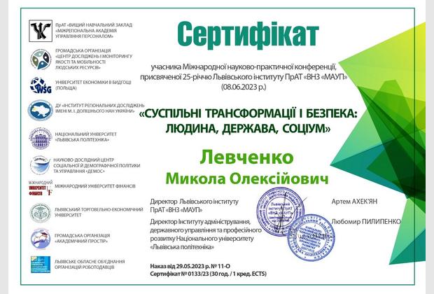 Доктор філософії в галузі державного управління, професор кафедри організації туристичної діяльності Навчально-наукового інституту управління, економіки та бізнесу Левченка М.О. взяв участь у Міжнародній науково-практичній конференції "MODERN PROBLEMS OF SCIENCE, EDUCATION AND SOCIETY", 17-19 червня 2023 р., м. Київ, Україна, а також отримав сертифікат учасника Міжнародної науково-практичної конференції, присвяченої 25-річчю Львівського інституту ПрАТ «ВНЗ «МАУП» на тему: «СУСПІЛЬНІ ТРАНСФОРМАЦІЇ І БЕЗПЕКА: