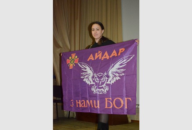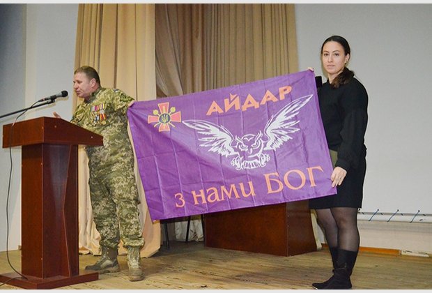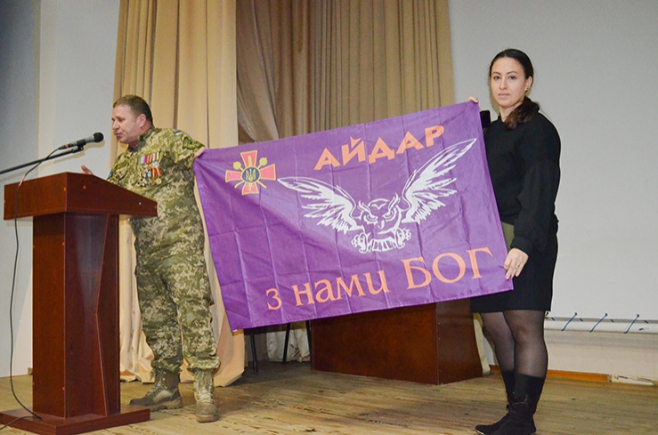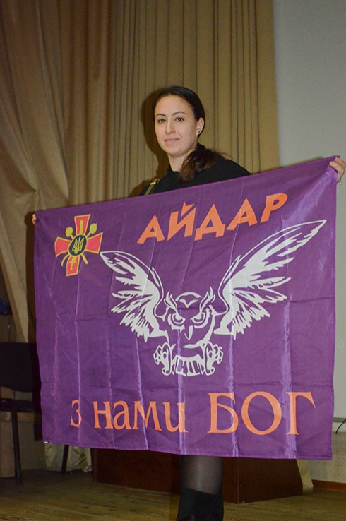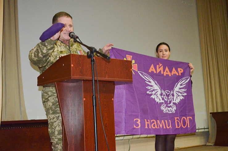 Розповіді учасників заходу супроводжувались показом фотографій, уривків з фільму. На пам’ять про зустріч айдарівці подарували Міжрегіональній Академії управління персоналом стяг батальйону.