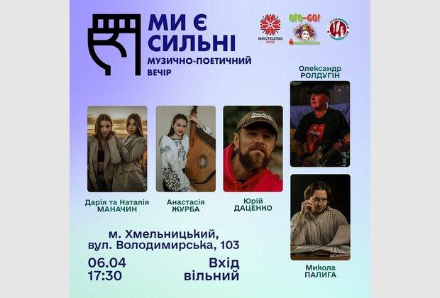 6 квітня на музично-поетичному заході звучали твори українських поетів та письменників, волонтерів, музикантів. Учасники та гості спілкувалися про українців, про єдність, силу, духовність та підтримку тих, хто боронить нашу країну від рук російського окупанта. Організатором музично-поетичного вечора став Хмельницький обласний науково-методичний центр культури і мистецтва