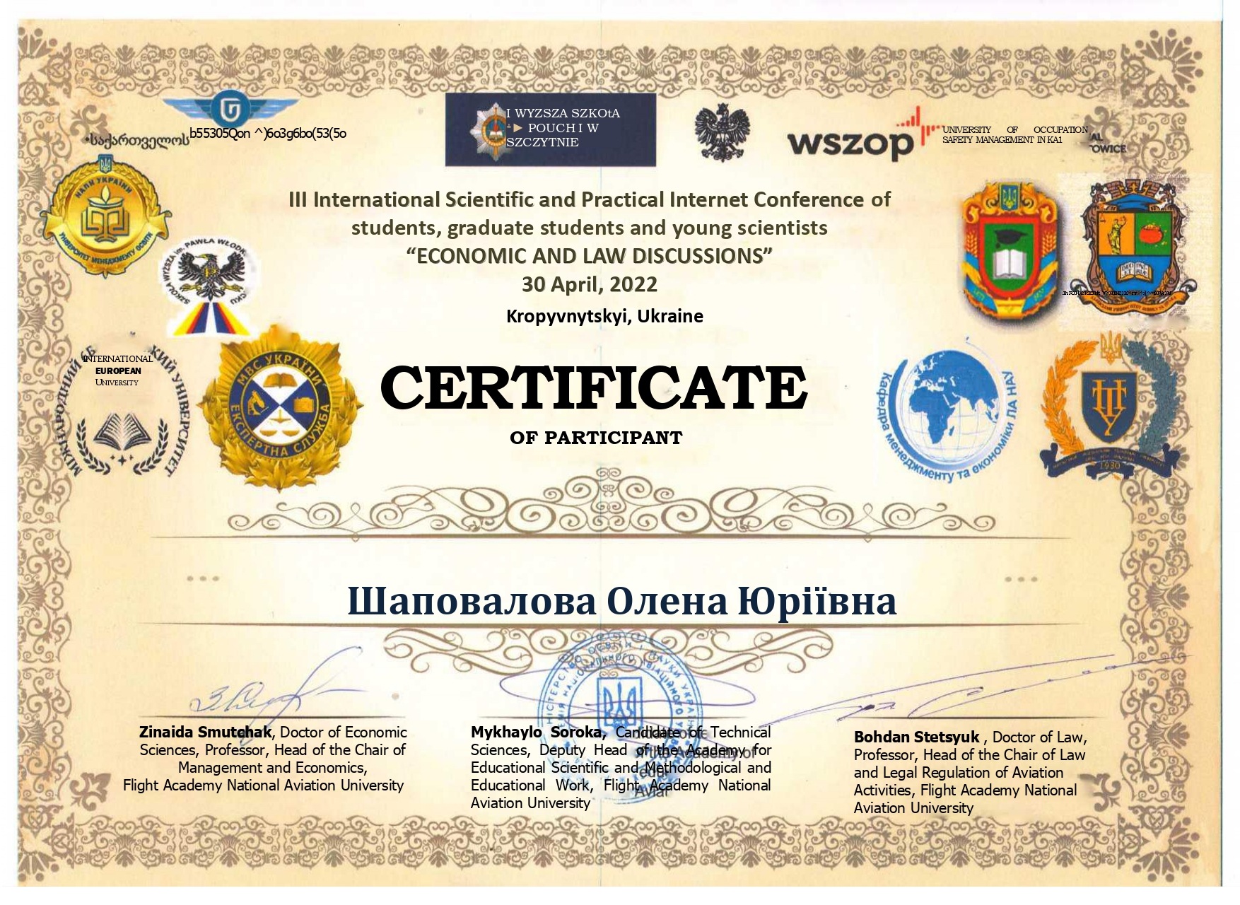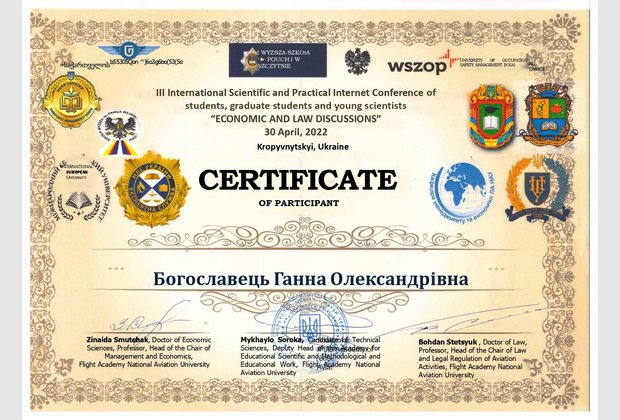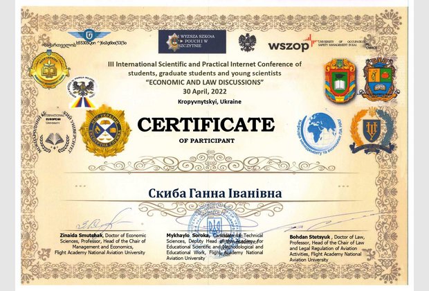 Студенти кафедри обліку та оподаткування Навчально-наукового інституту управління, економіки та бізнесу під керівництвом доцента кафедри, кандидата економічних наук, доцента Скиби Ганни Іванівни взяли активну участь у ІІI Міжнародній науково-практичній Інтернет-конференції студентів, аспірантів та науковців «Економіко-правові дискусії», що відбулася у м. Кропивницький. Наших здобувачів та їх наукового керівника нагородили сертифікатами.