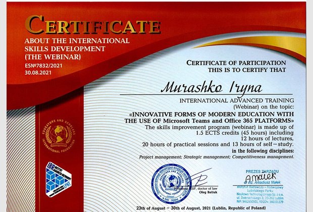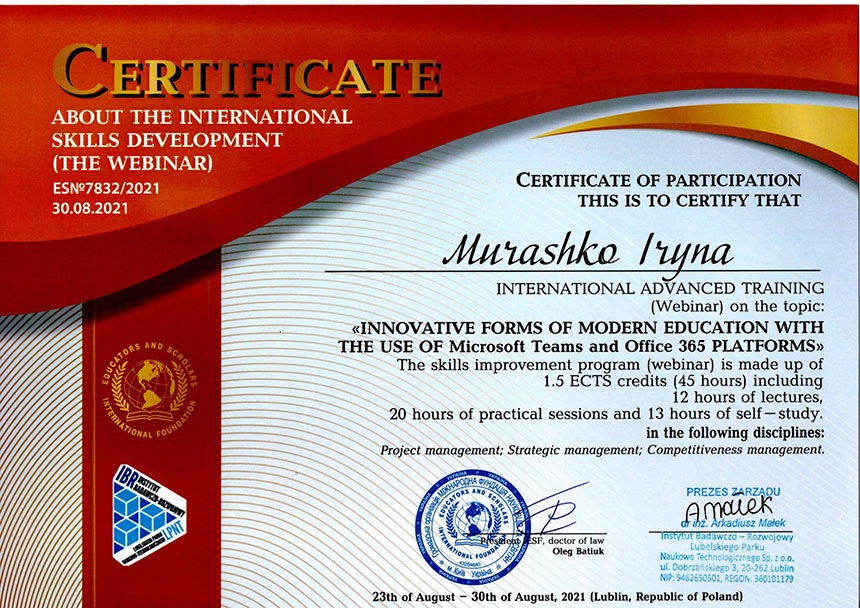 К.е.н. Мурашко І. С. підвищила професійні компетенції шляхом участі в Програмі підвищення кваліфікації в країні Польща в період з 23.08. 2021 р. по 30.08.2021 р..