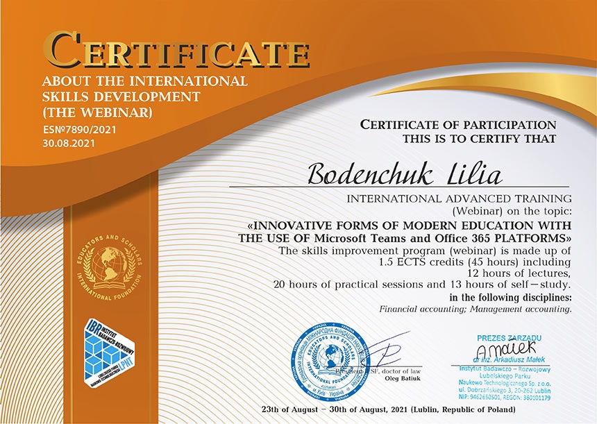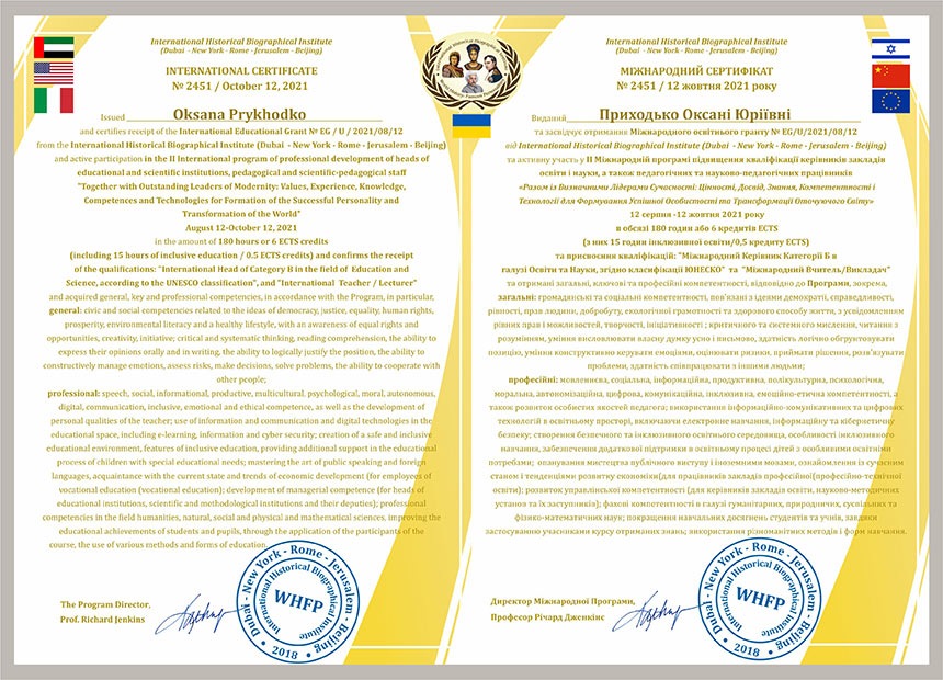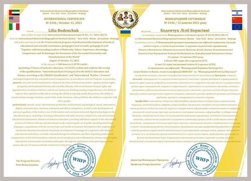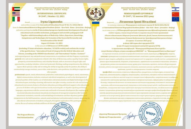 Так, к.е.н. Боденчук Л. Б., к.е.н., доцент Ліганенко І. В., викладач Приходько О. Ю. отримали кваліфікацію «Міжнародний керівник категорії - "Б" в галузі освіти і науки, згідно класифікації ЮНЕСКО та кваліфікацію «Міжнародний вчитель/викладач», після проходження 18 годин (6 кредитів ECTS) в International Historical Biographical Institute (серпень-жовтень 2021 р.).