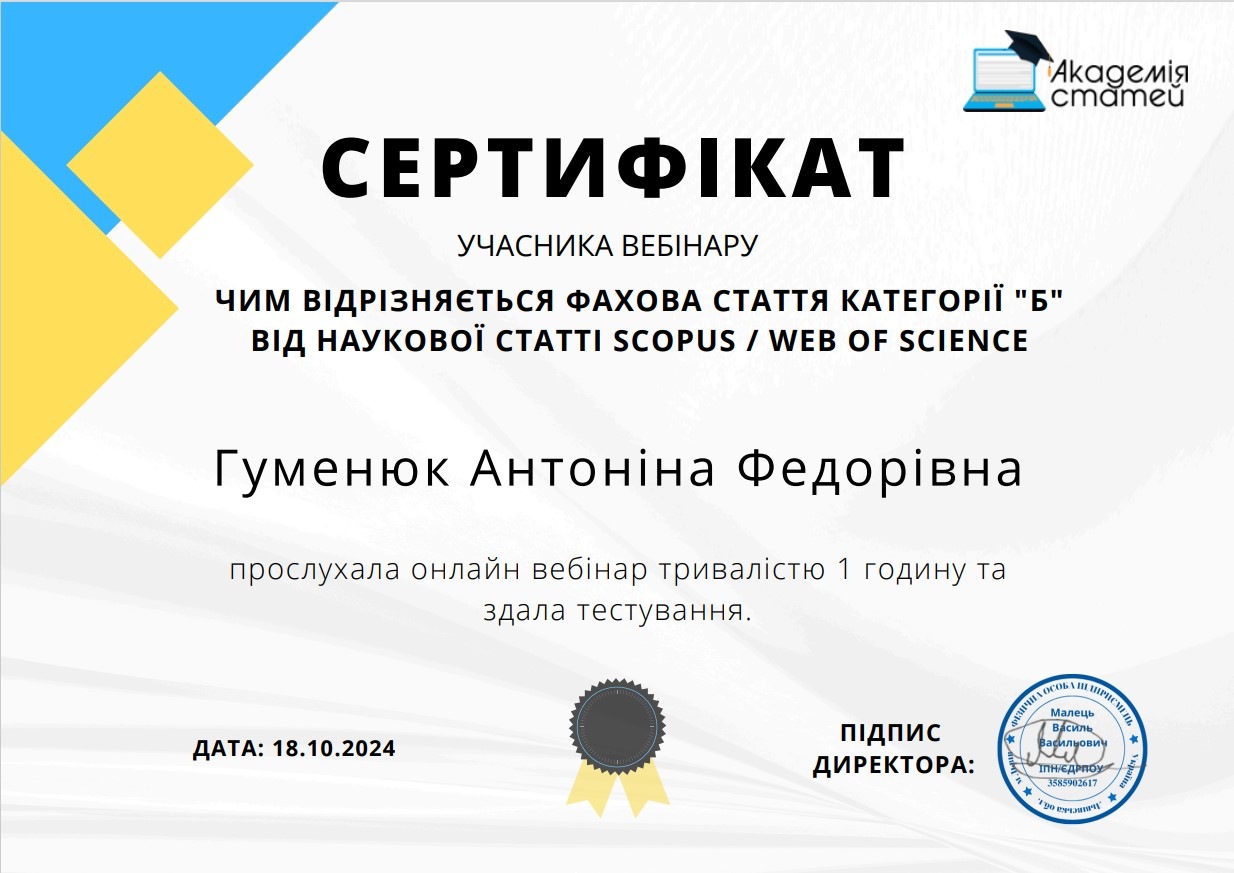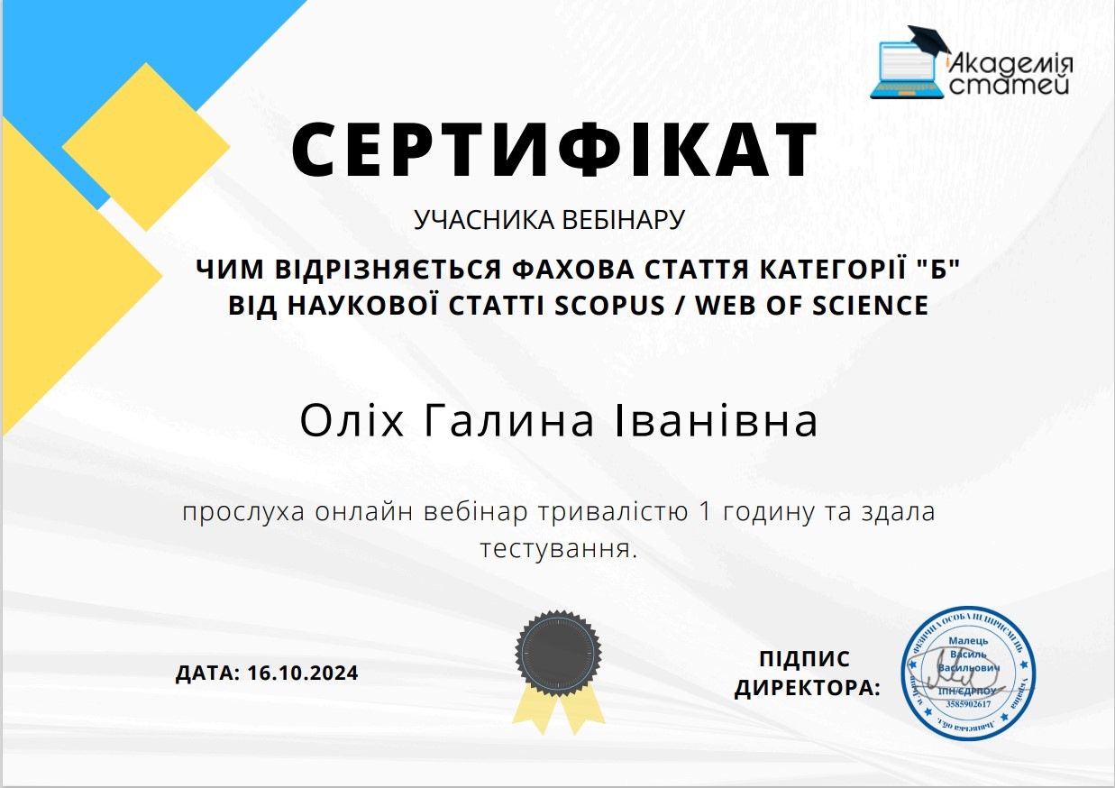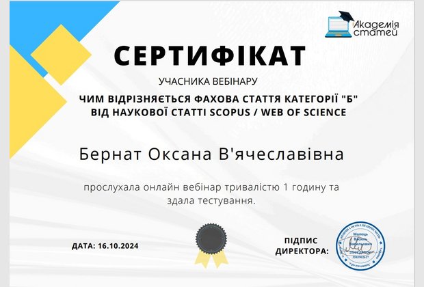 У жовтні 2024 року Цимбалюк Ганна, Гуменюк Антоніна, Оліх Галина та Бернат Оксана взяли участь у вебінарі «Чим відрізняється фахова стаття категорії «Б» від наукової статті Scopus/Web of Sience». Вебінар стосувався правильного написання наукової статті Scopus / WoS, яка різниця між статтями Scopus і фаховими статтями категорії "Б" і в чому відмінності публікації в фахових журналах України та журналах Scopus / Web of Science.