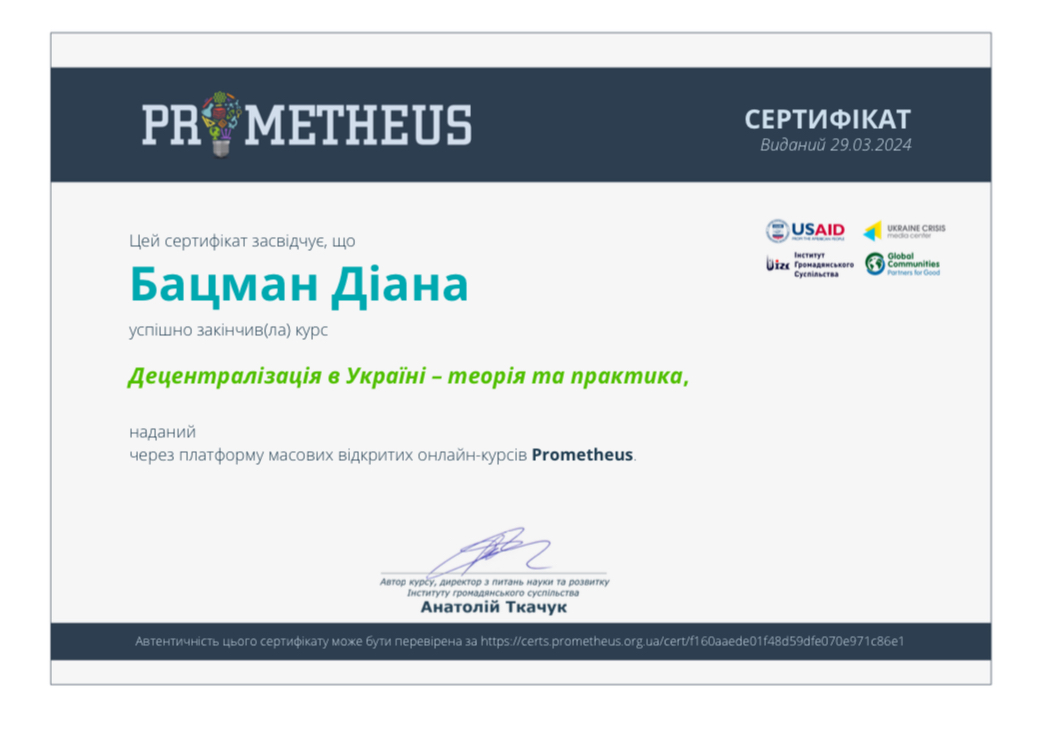 Освітні можливості платформи Прометеус стали у нагоді у освітньому процесі (Навчально-науковий інститут управління, економіки та бізнесу). Зокрема, здобувачі магістерського рівня освіти за спеціальністю 281 за бажанням пройшли курс «Децентралізація влади в Україні» та отримали додаткові бали за окремі теми з дисципліни «Децентралізація влади та реформи державного управління».