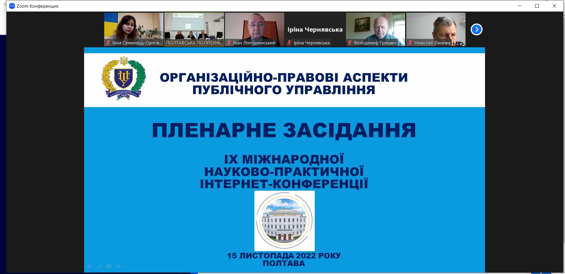 15 листопада директор Навчально-наукового інституту управління, економіки та бізнесу І.А. Семенець-Орлова виступила з вітальним словом від Міжрегіональної Академії управління персоналом на Міжнародній науково-практичній інтернет-конференції "Організаційно-правові аспекти публічного управління". На запрошення партнерської кафедри публічного управління, адміністрування та права Полтавського національного технічного університету колектив інституту не вперше долучається до актуальних наукових дискусій. У полі дискурсу науковців цього року - виклики модернізації публічного управління в умовах військового стану.