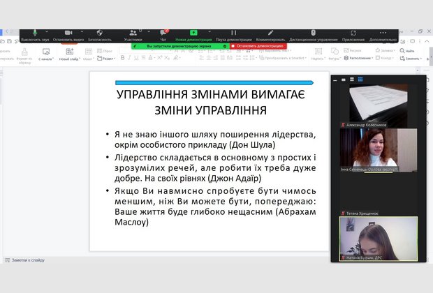 Директор ННІУЕБ Семенець-Орлова І.А. разом із доцентом кафедри менедждменту Новальською Н.І. розпочали реалізацію спеціальної короткострокової програми "Сприйняття змін та інновацій, впровадження та управління змінами в державних установах та організаціях". Замовником освітніх послуг виступає Державна регуляторна служба України (ДРС). Співпраця цього органу влади у забезпеченні підвищення кваліфікації державних службовців з МАУП триває уже більше двох років. Найближчим часом розпочнеться реалізація інших освітніх програм для ДРС викладачами кафедри публічного адміністрування МАУП. Академія вдячна слухачам за схвальні відгуки.