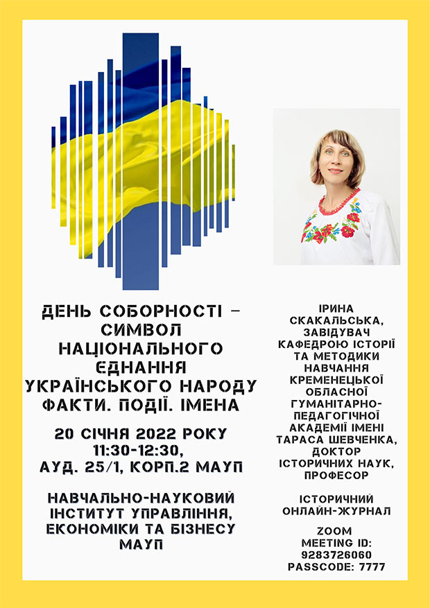 Навчально-науковий інститут управління, економіки та бізнесу МАУП запрошує здобувачів освіти, викладачів, усіх бажаючих долучитися до усного онлайн-журналу сторінками історії і сьогодення на тему "День Соборності ‒ символ національного єднання Українського народу. Факти. Події. Імена." Ведуча журналу: Ірина Богданівна Скакальська, завідувач кафедрою історії та методики навчання Кременецької обласної гуманітарно-педагогічної академії імені Тараса Шевченка, доктор історичних наук, професор. Захід відбудеться 20 січня 2022 р., о 11:30 у змішаному форматі - у ауд. 25/1 корпусу 2 Міжрегіональної Академії управління персоналом та на платформі zoom (Meeting ID: 9283726060, Passcode: 7777). Приєднуйтеся до відзначення Дня Соборності України!