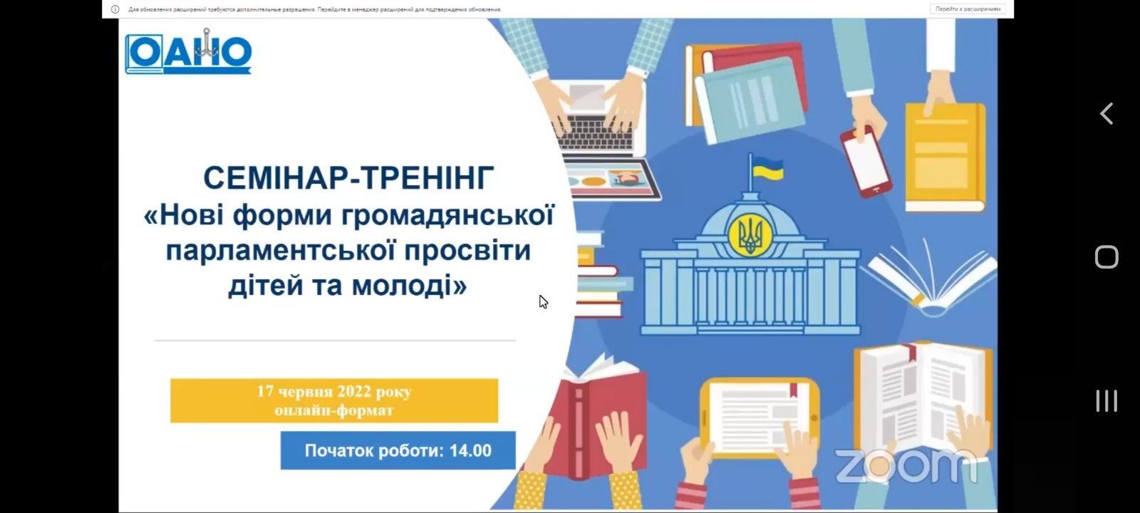 Голова Студентського наукового товариства Одеського інституту МАУП Арсеній Гаврилюк взяв участь в семінарі-тренінгу "Нові форми громадянської парламентської просвіти дітей та молоді", що відбувся 17 червня на платформі Zoom з прямою трансляцією у Фейсбуці.