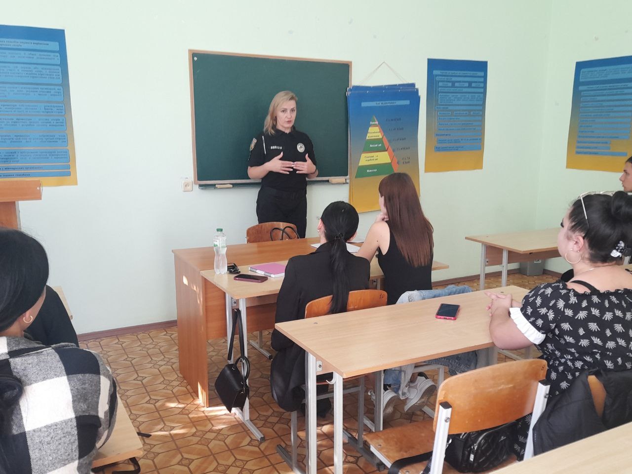 Під час агітаційної бесіди Тая Петрівна розповіла про структуру, завдання та функції СОБ, акцентувавши увагу на важливості захисту прав і безпеки освітніх установ та їх учасників у сучасних умовах. Вона детально зупинилася на тому, як саме служба взаємодіє з навчальними закладами, працює над попередженням правопорушень серед молоді та забезпеченням правопорядку в освітньому середовищі.