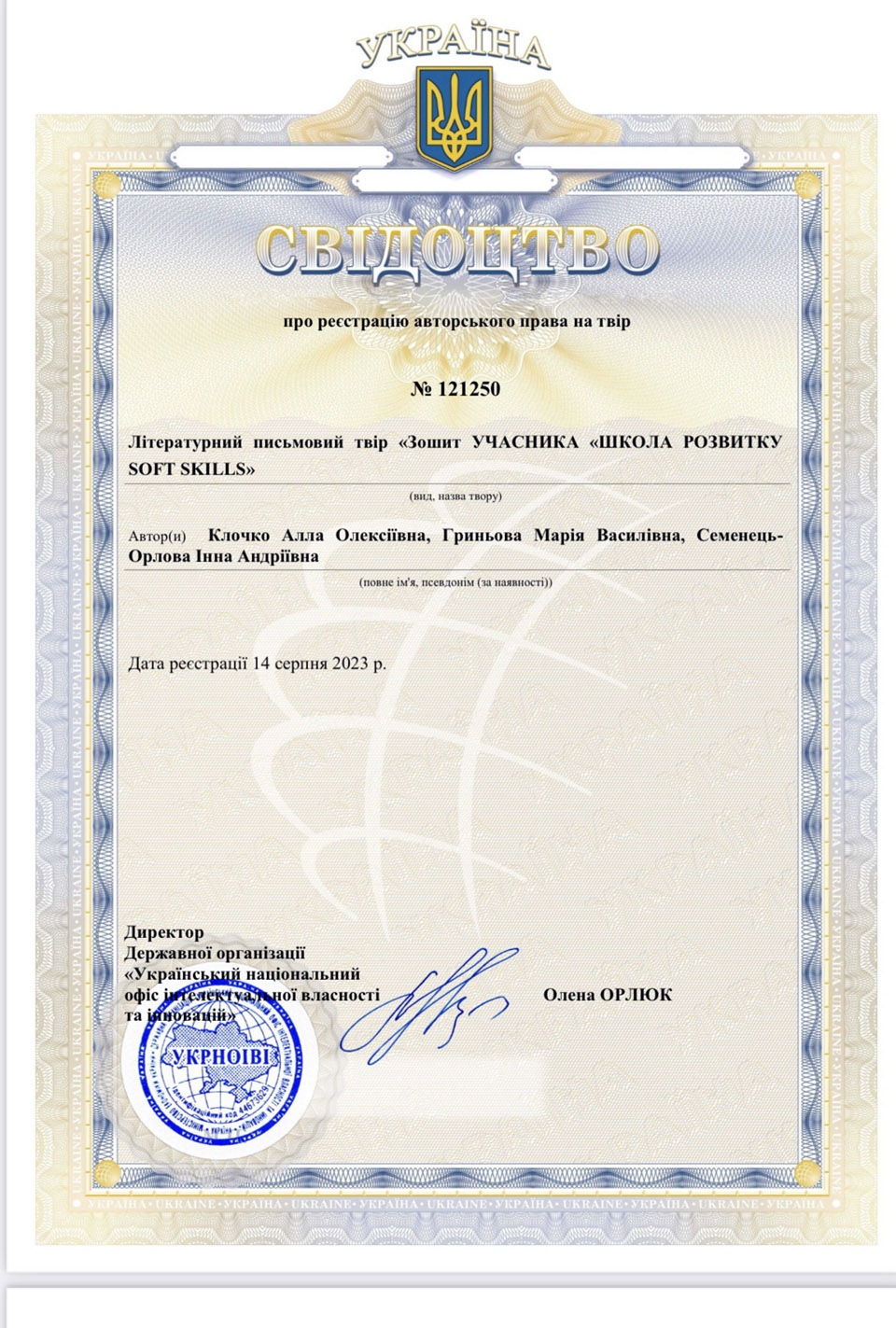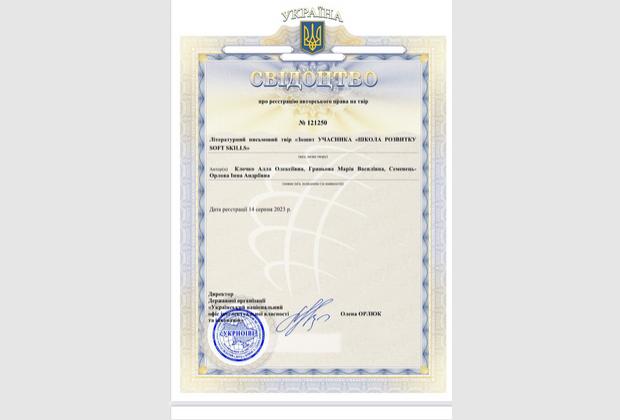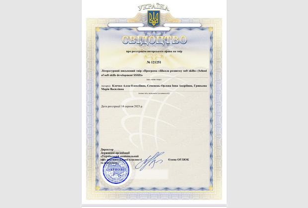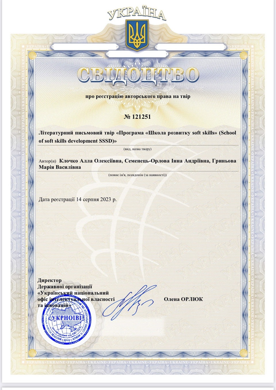 Директор Інституту управління, економіки та бізнесу МАУП Семенець-Орлова Інна Андріївна отримала свідоцтва за результатами реєстрації (у складі колективу авторів) авторського права на твори.Авторське право було зареєстровано на дві освітні розробки, які стали результатами реалізації громадських та волонтерських ініціатив І. Семенець-Орлової (а саме, організації та роботи Літнього табору для дітей-військовослужбовців) впродовж 2022 року.