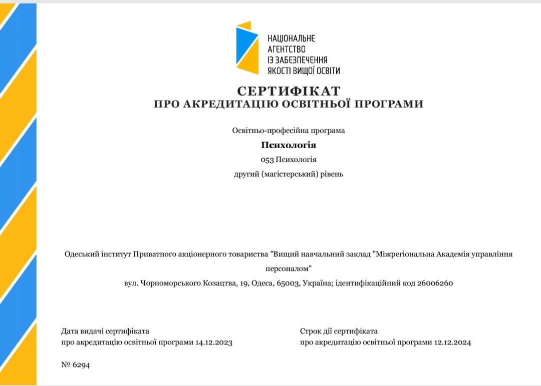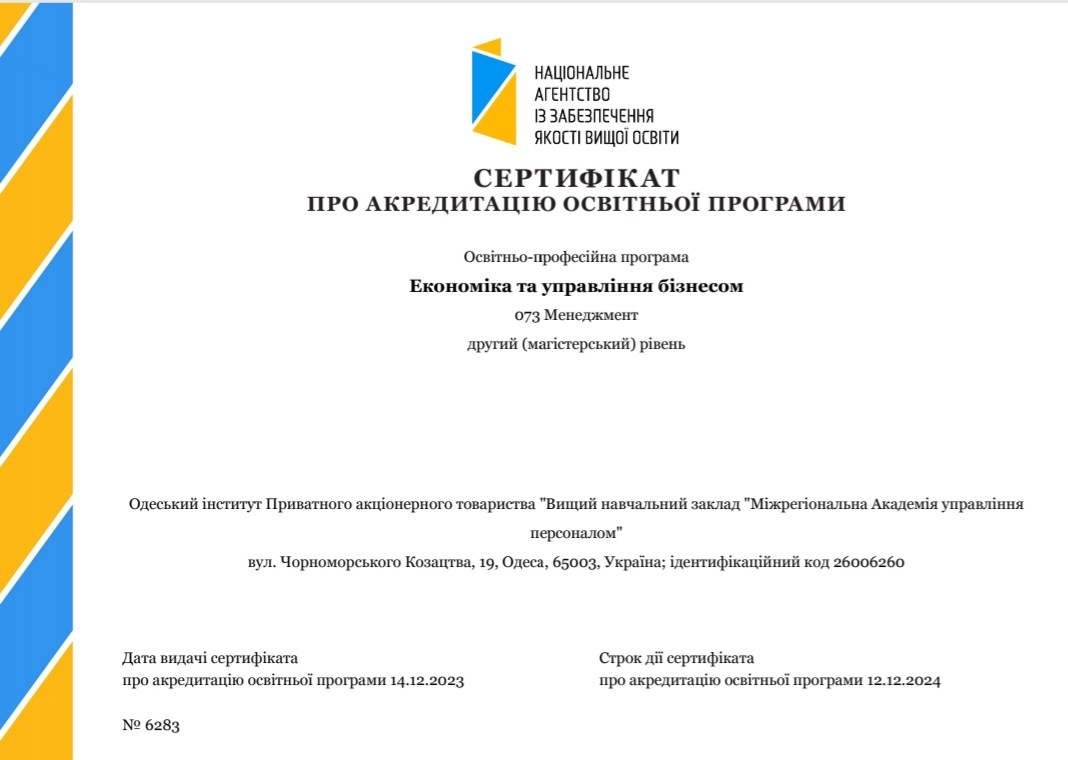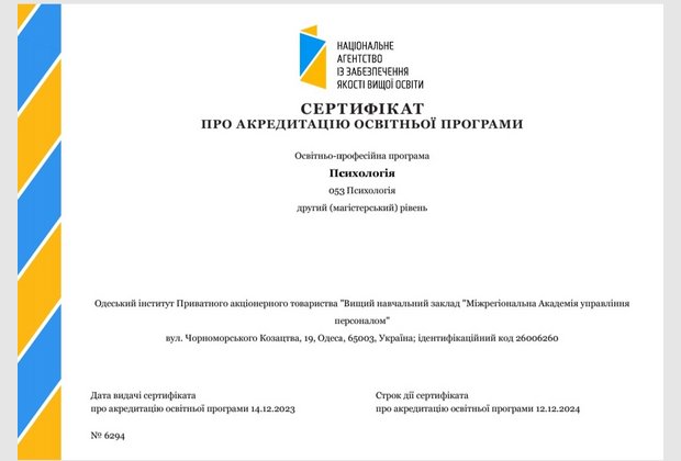 Одеський інститут МАУП успішно пройшов акредитацію за вимогами Національної агенції із забезпечення якості вищої освіти (НАЗЯВО) та 14 грудня 2023 року отримав сертифікати про акредитацію освітньої програми «Економіка та управління бізнесом» за спеціальністю 073 Менеджмент та освітньої програми «Психологія» за спеціальністю 053 Психологія для другого (магістерського) рівня.
