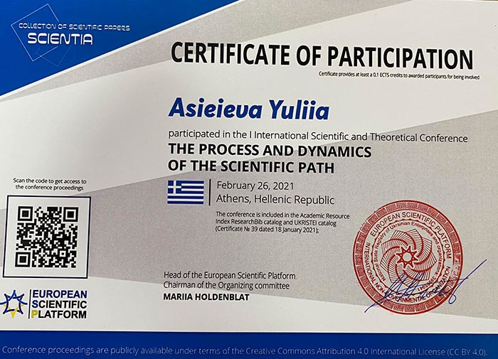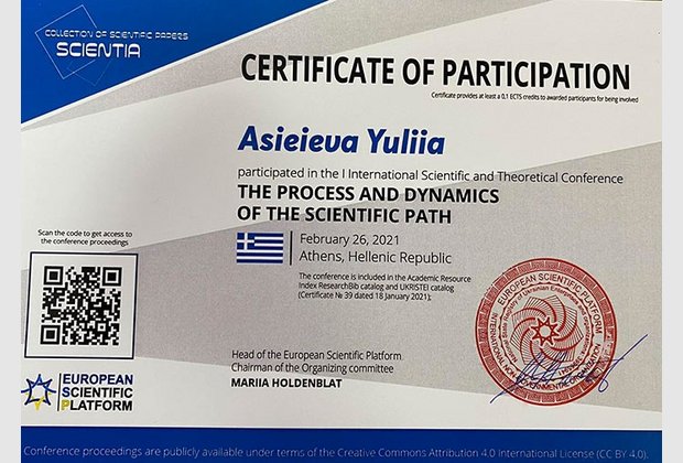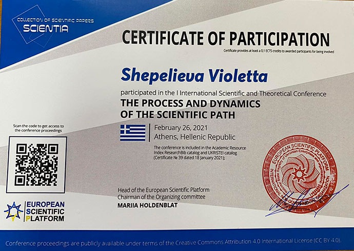 Одеський інститут пишається нашою студенткою 2 курсу спеціальності Психологія Віолеттою Шепєлєвою, яка активно займається студентською науковою роботою і є заступником Студентського наукового психологічного Клубу "ПСИХОЛОГ". Наразі Віолетта, не зважаючи на те, що навчається на молодшому курсі, порадувала всіх участю 26.02.2021 р. в Міжнародній науковій конференції "The process аnd dinamics of the scientific path" в м. Атени, Греція. Її доповідь у співавторстві з науковим керівником к.психол.н. Юлією Асєєвою "Teens' aggression in the period of education adaptation in the higher educational establishment" опубліковано в Збірнику наукових праць, випуск 2 за 2021 р. Віолетта отримала Сертифікат учасника. Попереду у талановитої студентки - нові вершини і досягнення, і вона завжди може розраховувати на підтримку академічної спільноти Інституту.