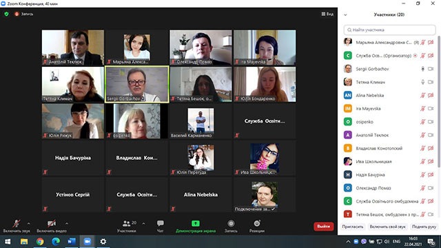 22 квітня 2021 року освітнім омбудсменом України було проведено зустріч в онлайн-форматі на платформі Zoom зі студентськими омбудсменами всіх ЗВО.