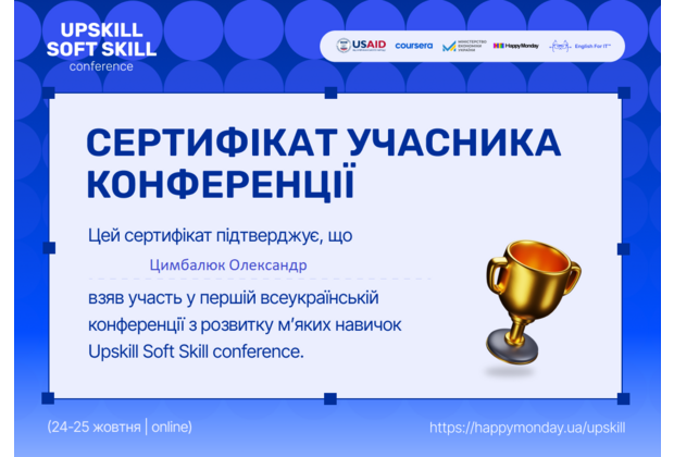Викладачі та студенти кафедри економіки та управління Хмельницького інституту МАУП 24-25 жовтня 2024 року взяли участь у першій всеукраїнській онлайн-конференції з розвитку м’яких навичок — Upskill Soft Skill Conference