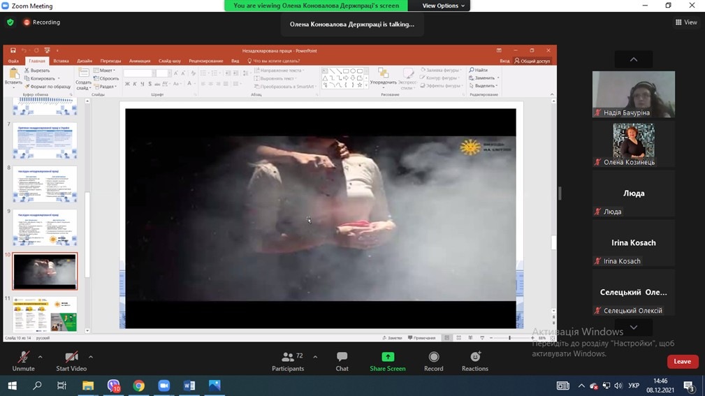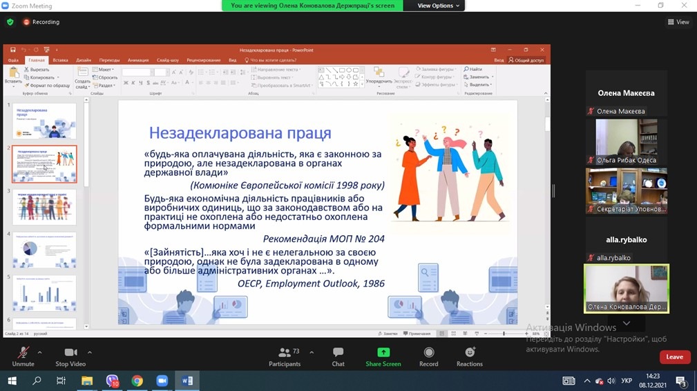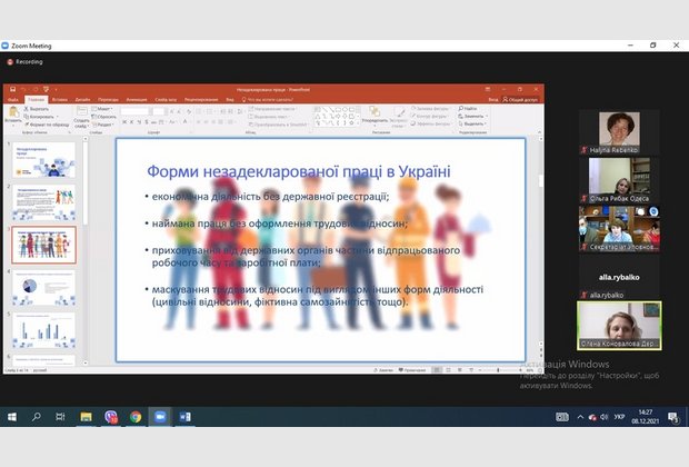 На сьогодні дуже важливо, щоб кожна людина знала свої права, які визнані державою та суспільством. Під час онлайн-зустрічі було окреслено актуальні проблеми у сфері дотримання прав людини. Зокрема, заступник директора Департаменту з питань праці Державної служби України з питань праці Олена Коновалова представила до уваги слухачів виступ на тему: «Переваги офіційного працевлаштування на роботу та щодо ризиків у зв’язку з незалежним оформленням трудових відносин».