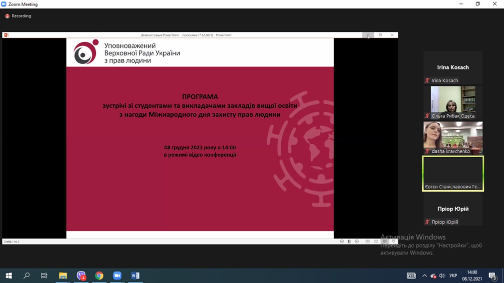 В рамках реалізації меморандуму про співпрацю, а також з нагоди Міжнародного дня захисту прав людини Секретаріатом Уповноваженого Верховної Ради з прав людини 08 грудня 2021р. відбулася онлайн-конференція, в якій взяли участь представники Одеського інституту МАУП: Ольга Рибак – заступник директора, Олена Золотарьова – доцент кафедри правових дисциплін, Діана Лукашова – Голова студентської ради.