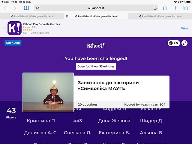 Студенти із задоволенням зареєструвалися в системі "Kahoot Play" та відповіли на 20 запитань.
