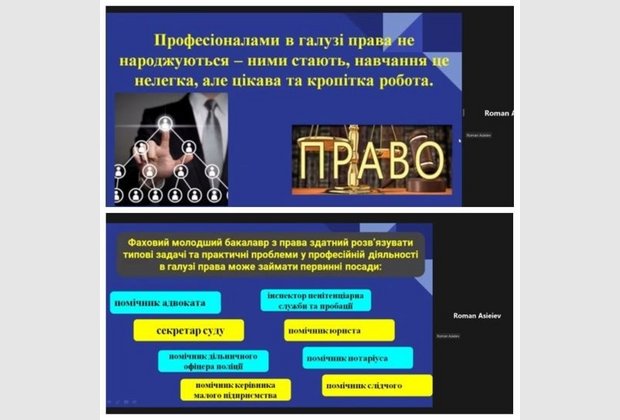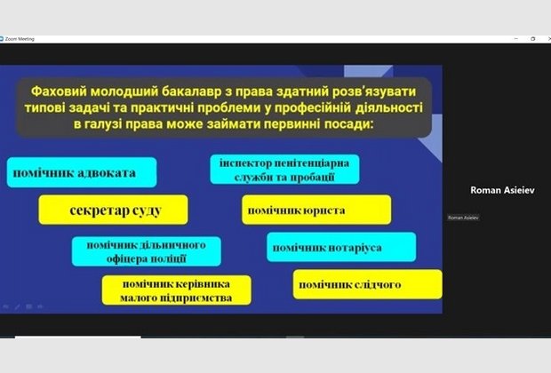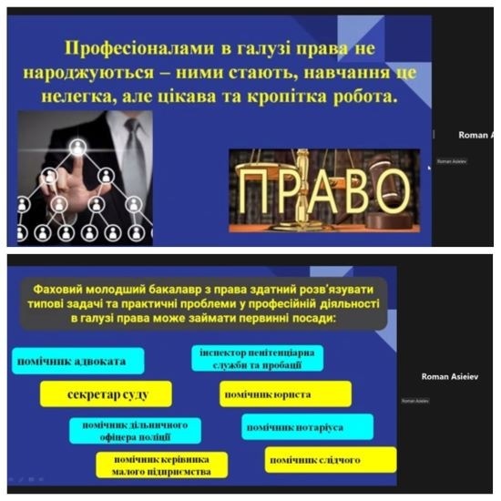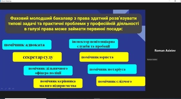 Асєєв Роман Олександрович, ст.викл., в.о.зав.кафедри правових дисциплін, знайомлячи присутніх зі специфікою навчання за спеціальністю 081 «Право» озвучив, що професіоналами в галузі права не народжуються – ними стають, навчання це не легка, але цікава та кропітка робота. Кафедра правових дисциплін має належний кадровий потенціал викладачів та практикуючих юристів, що дає змогу підготувати висококваліфікованого та конкурентно спроможного фахівця в галузі права.