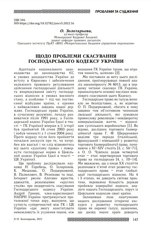 Вийшов друком 5-й випуск Юридичного вісника - фахового журналу НУ "Одеська юридична академія", в якому опубліковано статтю доцента кафедри правових дисциплін Одеського інституту МАУП, ад'юнкт-професора Олени Золотарьової "Щодо проблеми скасування Господарського кодексу України".