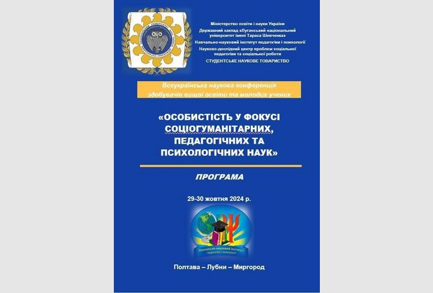 29-30 жовтня 2024 р. у рамках співпраці Навчально-наукового інституту психології та соціальних наук ПрАТ «ВНЗ «МАУП» з ДЗ «Луганський національний університет імені Тараса Шевченка» відбулася Всеукраїнська наукова конференція здобувачів вищої освіти та молодих учених «Особистість у фокусі соціогуманітарних, педагогічних та психологічних наук».