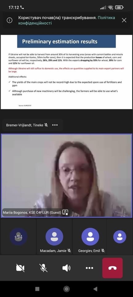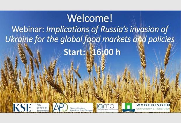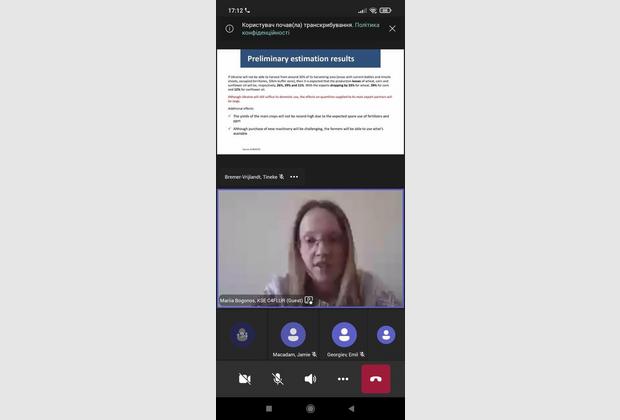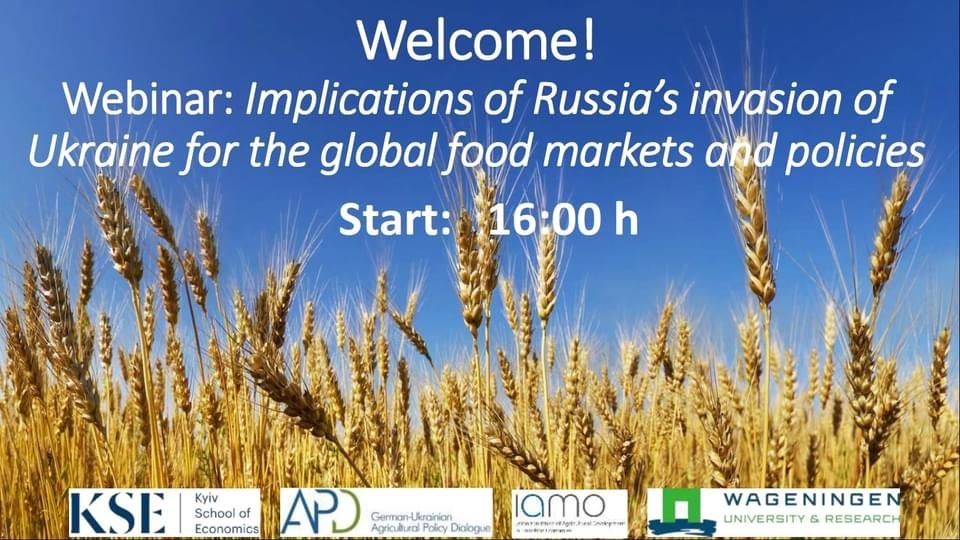 31 березня 2022 року викладачі та аспіранти кафедри фінансів, банківської та страхової справи ННІУЕБ взяли участь у першому вебінарі із серії панельних дискусій на тему «Наслідки вторгнення росії в Україну на світові ринки та продовольчу політику». Цей захід у форматі онлайн був спільно організований Київською школою економіки (KSE, Україна), Wageningen University & Research (WUR, Netherlands), Leibniz Institute of Agricultural Development in Transition Economies (IAMO, Germany) and German-Ukrainian Agricultural Policy Dialogue (APD, Ukraine).