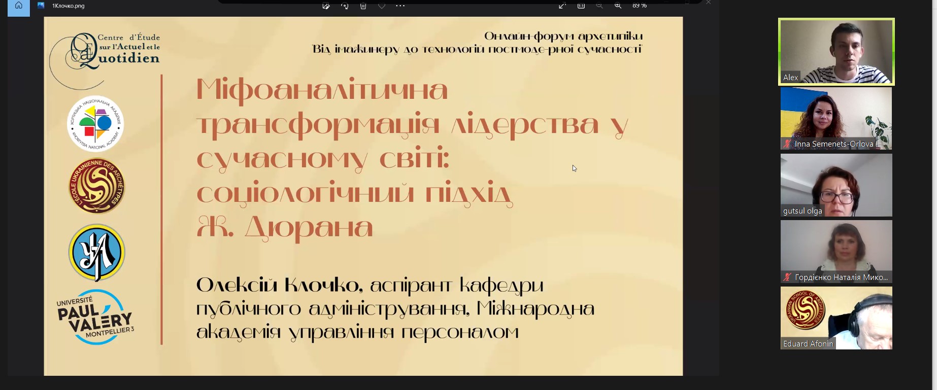 Здобувач вищої освіти третього рівня (доктора філософії) кафедри публічного адміністрування ННІУЕБ Олексій Клочко отримав перемогу у Х МІЖНАРОДНОМУ КОНКУРСІ МОЛОДИХ НАУКОВЦІВ “Архетипіка і публічне управління: від імажинеру до технологій постмодерної сучасності” (конкурс проведено Українською школою архетипіки у співпраці з Центром дослідження сучасного і повсякденного життя та Лабораторією соціології LERSEM-IRSA EA4584 Університету Монпельє-3 імені Поля Валері, Франція впродовж квітня-червня 2022 р.). Наукова робота Олексій Клочко “Міфоаналітична трансформація лідерства у сучасному світі: соціологічний підхід Ж. Дюрана” була високо оцінена членами журі та у загальному рейтингу конкурсантів була відзначена 3-ім місцем. Колектив Академії щиро радіє успіхам наших здобувачів!