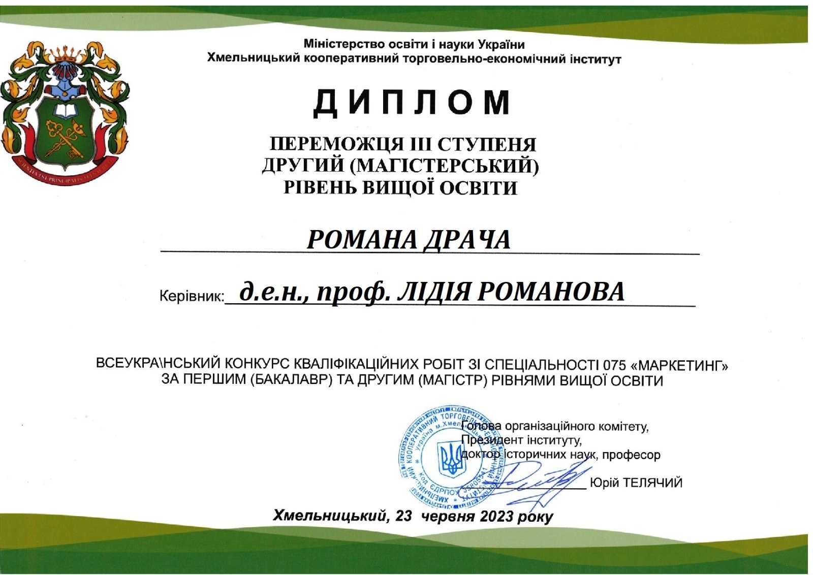 Щиро вітаємо студента кафедри маркетингу ННІУЕБ Романа Драча та його наукового керівника доктора економічних наук, професора, професора кафедри маркетингу Лідію Василівну Романову з перемогою у Всеукраїнському конкурсі кваліфікаційних робіт зі спеціальності «Маркетинг»!!!