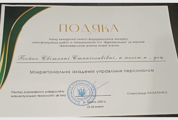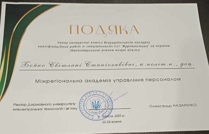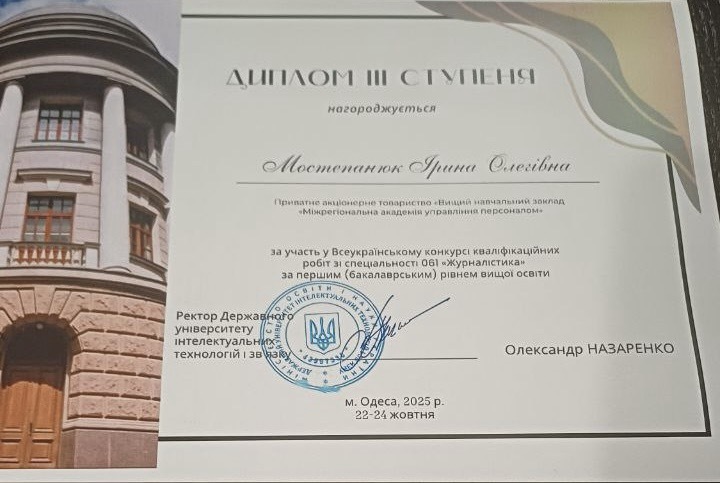 Студенти спеціальності «Журналістика» здобули призові місця у Всеукраїнському конкурсі кваліфікаційних робіт зі спеціальності 061 «Журналістика», продемонструвавши високий рівень професійної підготовки, аналітичної компетентності та творчого підходу.