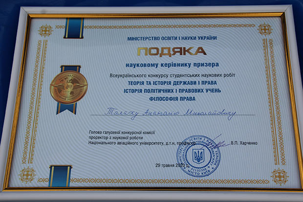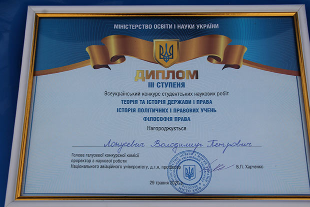 Дипломом III ступеня на Всеукраїнському конкурсі студентських наукових робіт «Теорія та історія держави і права», «Історія політичних і правових учень», «Філософія права» нагороджено Лопусевича Володимира Петровича та оголошено подяку науковому керівнику призера Талаху Анатолія Миколайовича.